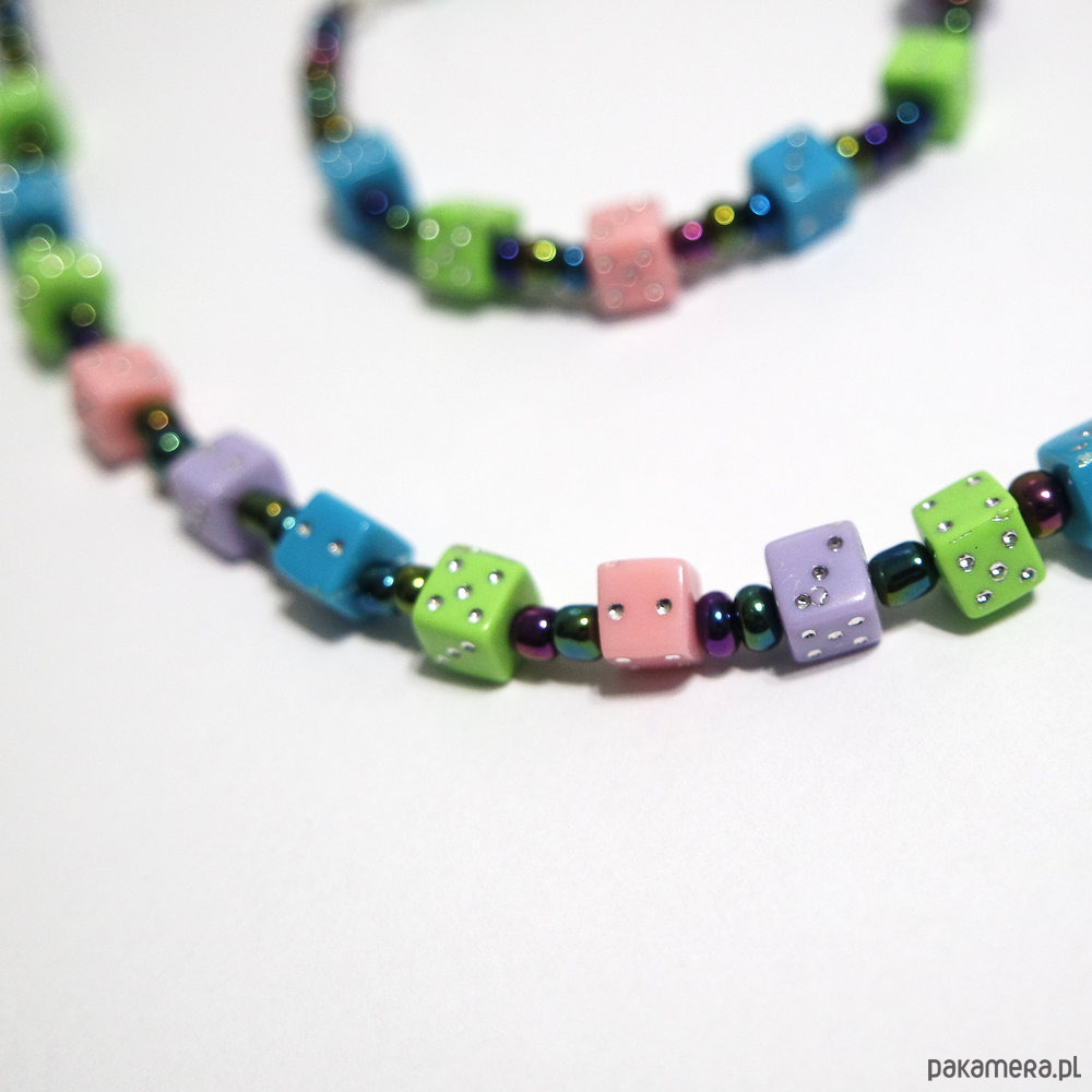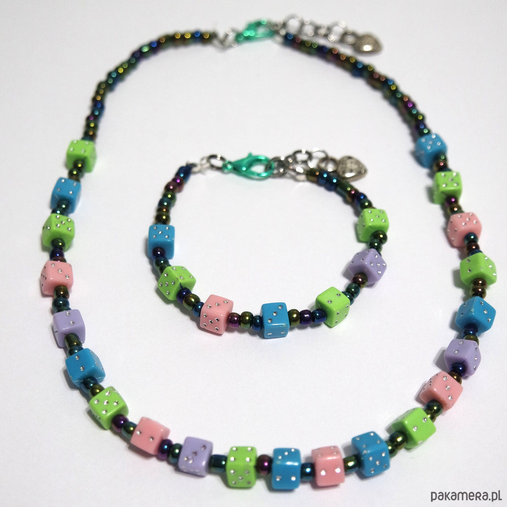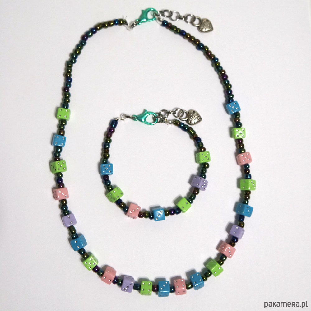 Naszyjnik i bransoletka z mini kosteczkami do gry i kolorowymi koralikami.