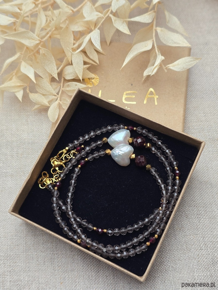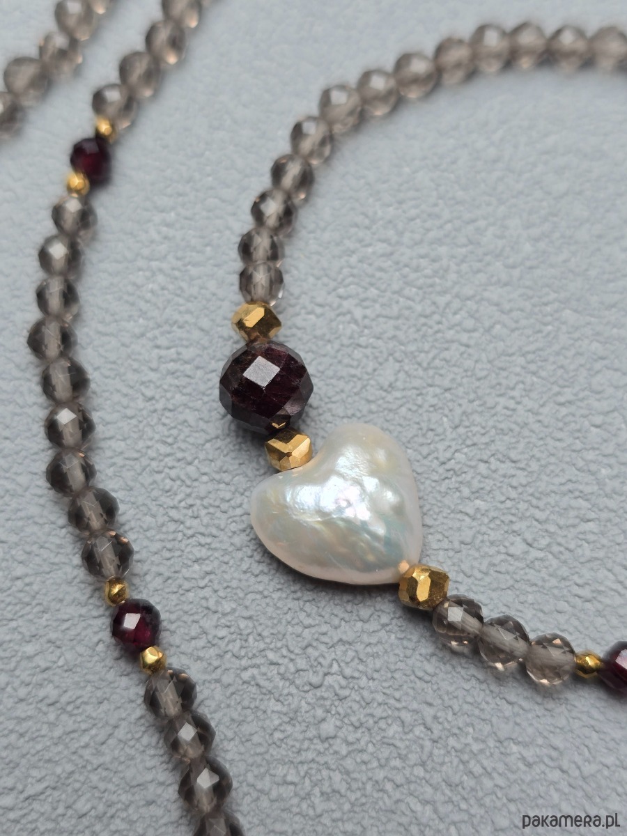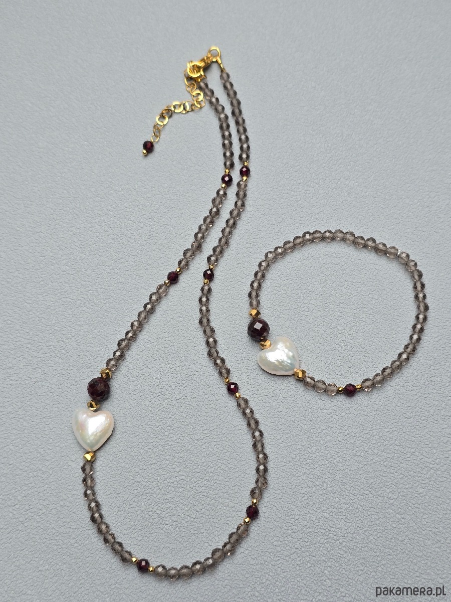 Komplet - krótszy naszyjnik z elastyczną bransoletką . Wykonany z kwarcu dymnego, granatu, złoconego hematytu i naturalnych pereł w kształcie serca
