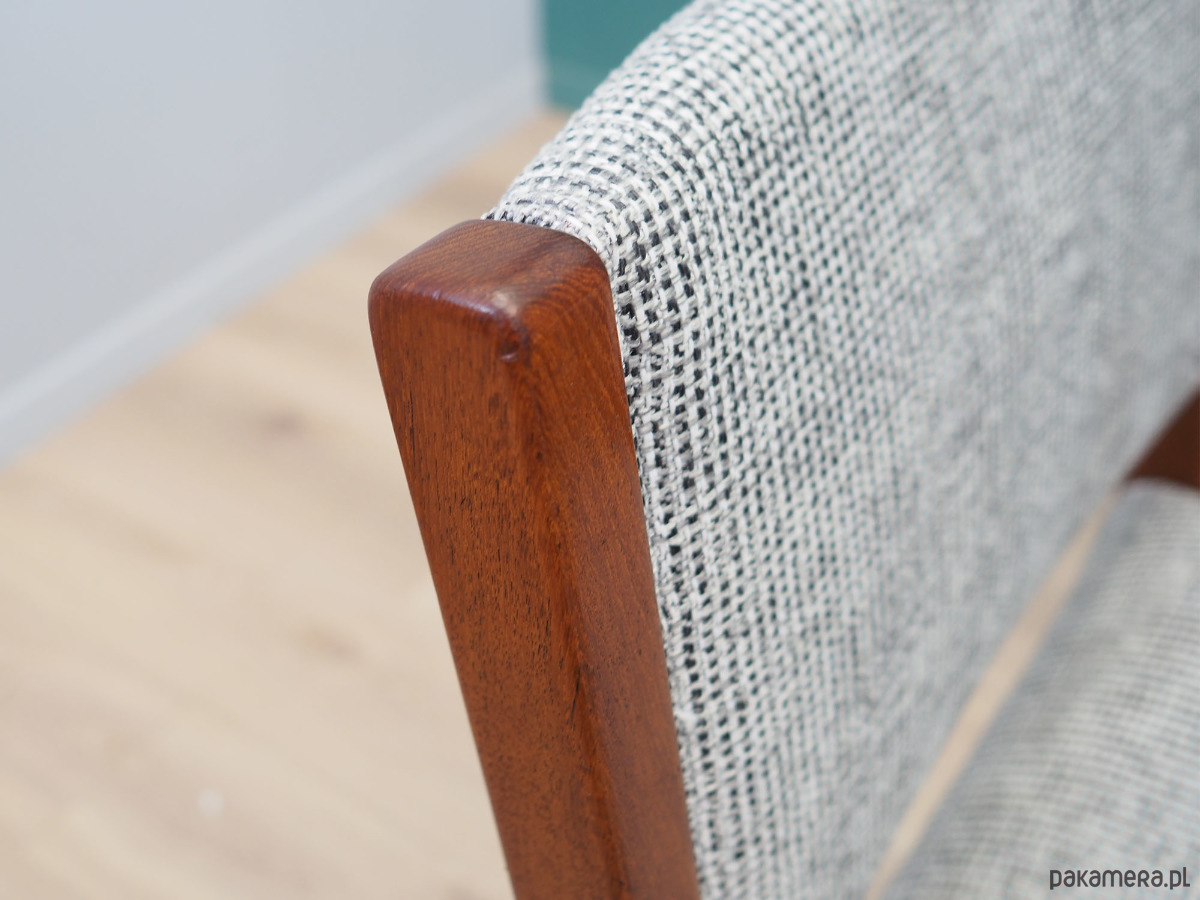 Konstrukcja wykonana jest z drewna tekowego. Drewno po odświeżeniu. Krzesła posiadają nową tapicerkę. Tapicerka została wykonana w kolorze szarym, wykorzystana została wysokogatunkowa tkanina o wyraźnym splocie.