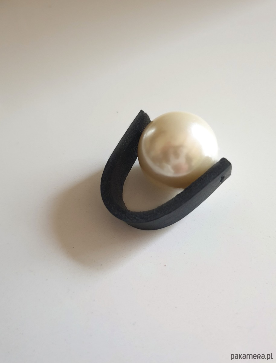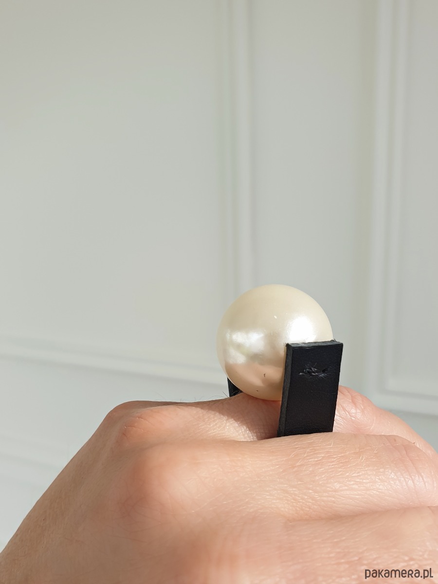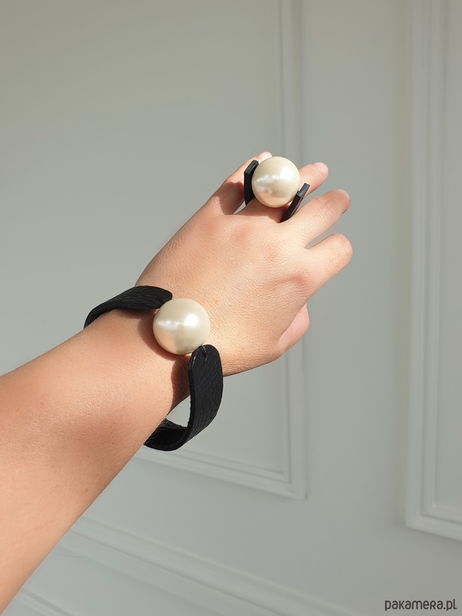 Komplet pierścionek i bransoletka ze skóry naturalnej czarnej z dużą perła