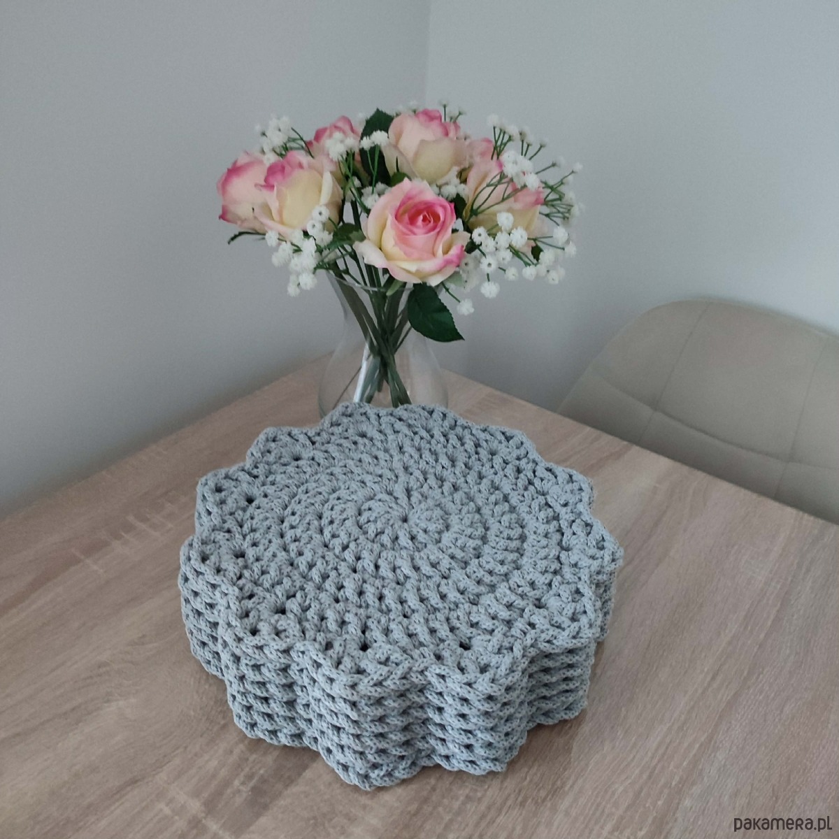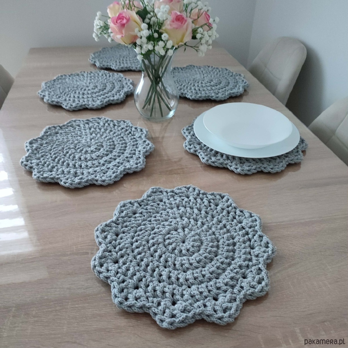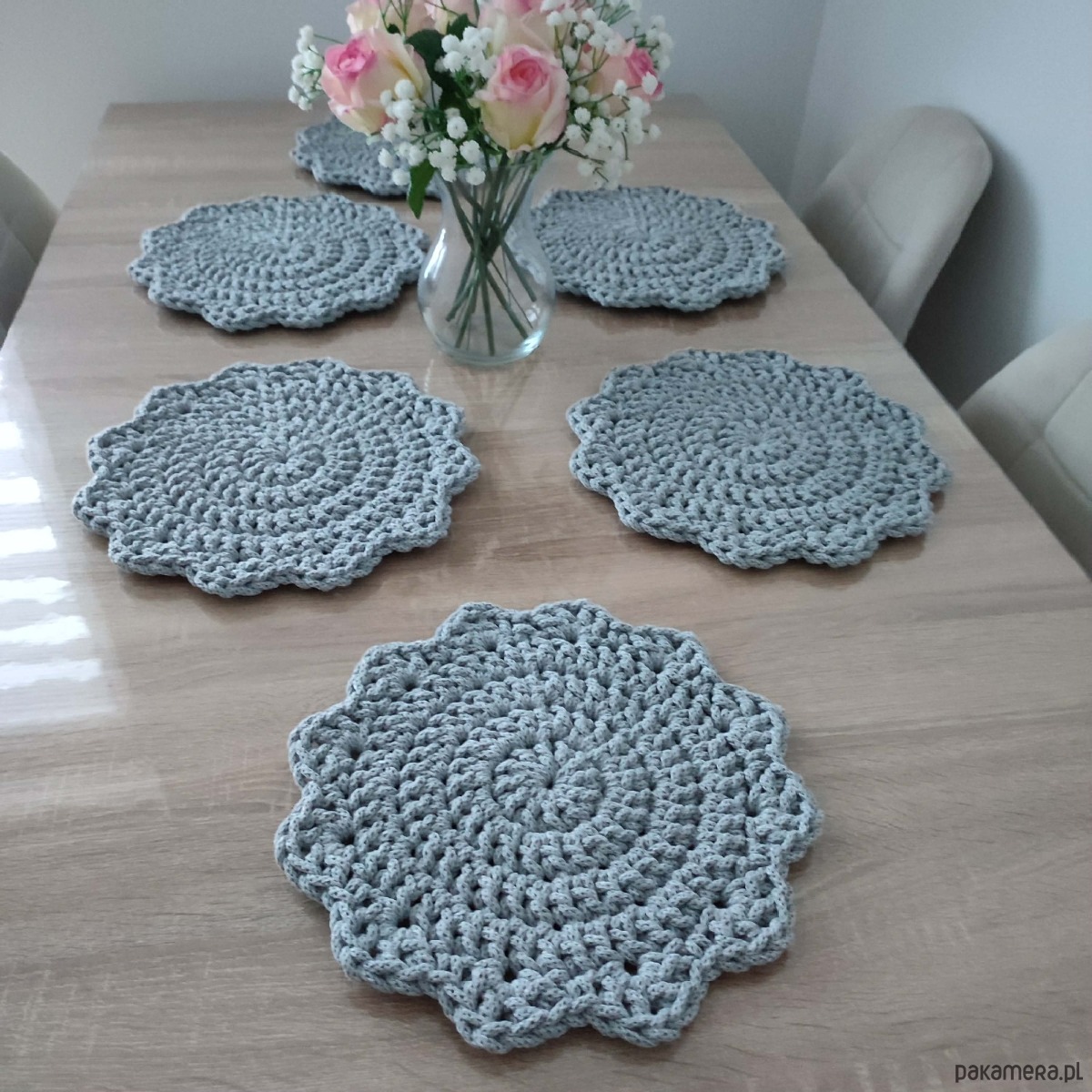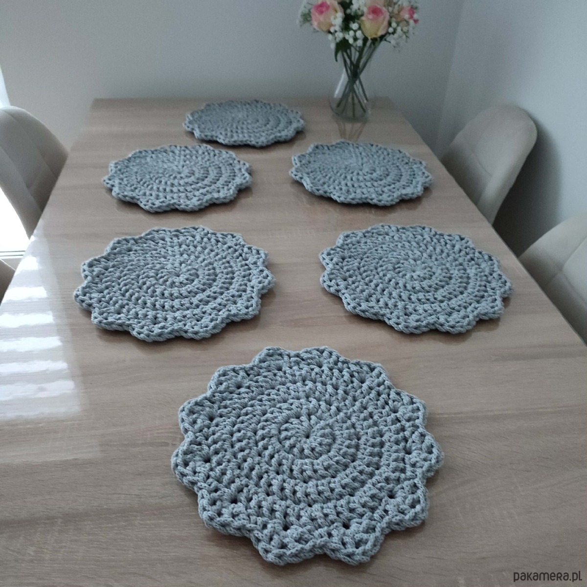 Komplet podkładek - 6 sztuk o średnicy 30cm, wykonany metodą szydełkowania z polskiego sznurka bawełnianego 5mm.