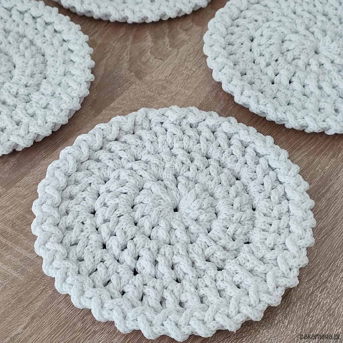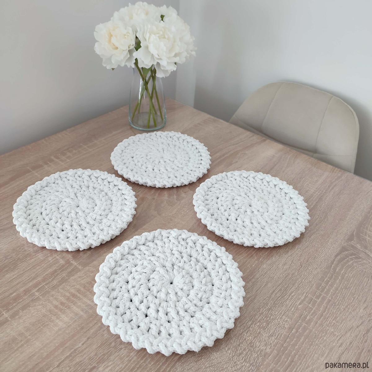 Komplet podkładek - 4 sztuki o średnicy 20cm, wykonany metodą szydełkowania z polskiego sznurka bawełnianego 5mm.