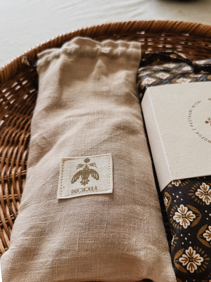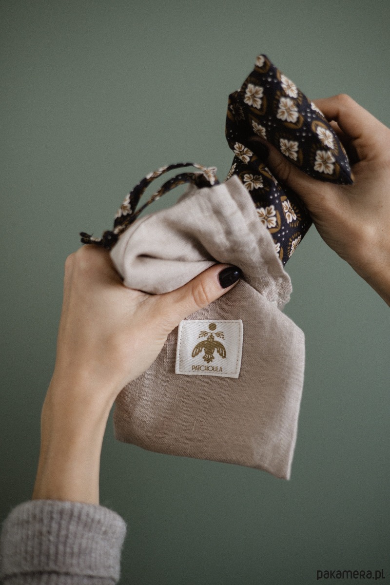 Bawełniana poduszka na oczy w komplecie z lnianym woreczkiem ściąganym wstążeczką dopasowaną kolorystycznie do poduszki.