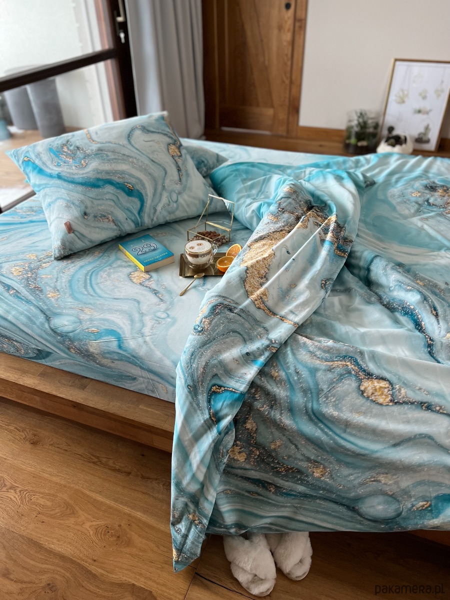 Zestaw pościeli z kolekcji Luxury Agate. Wzór artystycznej wersji niebieskiego agatu ze złotymi akcentami. Komplet zawiera poszwę na kołdrę oraz dwie poszewki na poduszki, które mają wszyty zamek błyskawiczny. Całość zapakowana w ozdobny worek ze ściągaczem w taki sam nadruk. Poszewki do wyboru 50x60 lub 70x80.