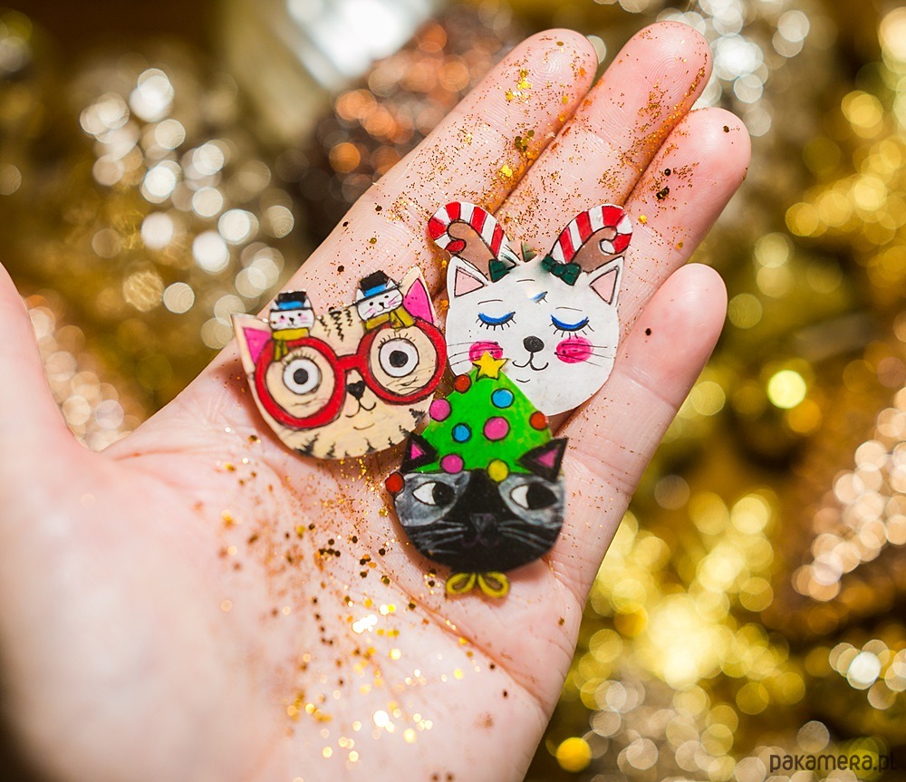 Komplet broszek z 3 słodkimi kotami. Jackiem, Plackiem i Agatką :) Te koty są pogromcami świąt Bożego Narodzenia. Jacek odpowiada za bałagan w kuchni, Placek zajmuje się karpiem, a Agatka wesoło buja się na choince i boksuje bombki.
