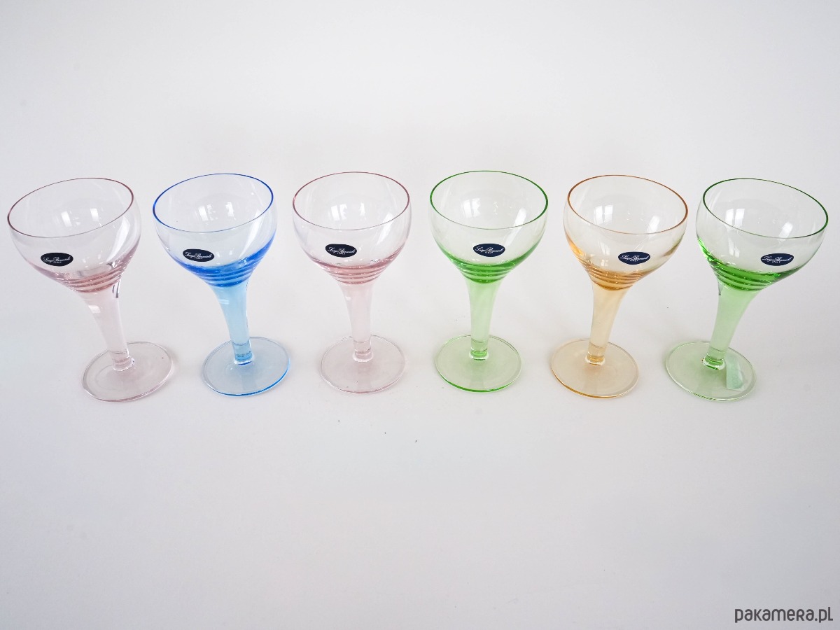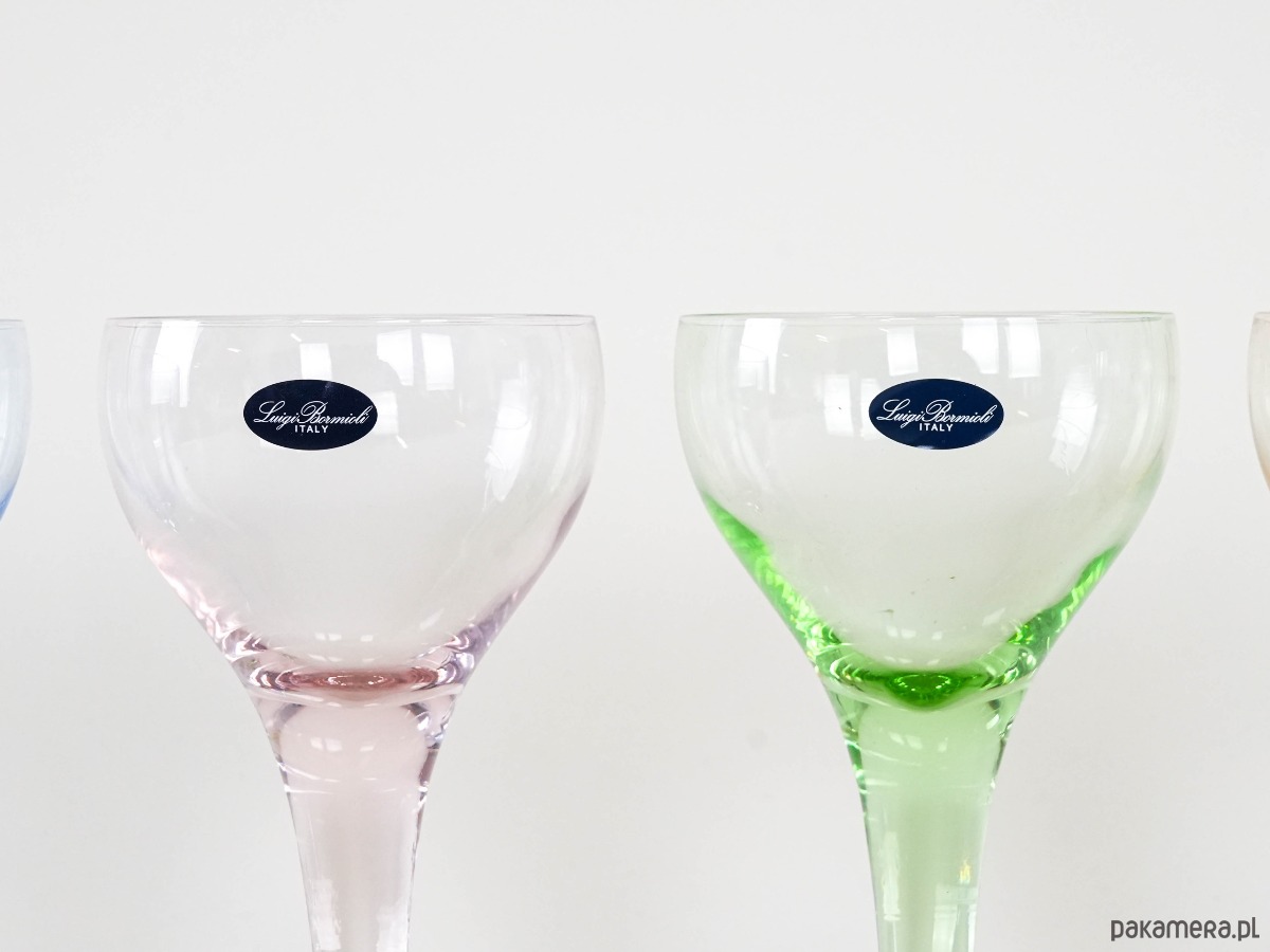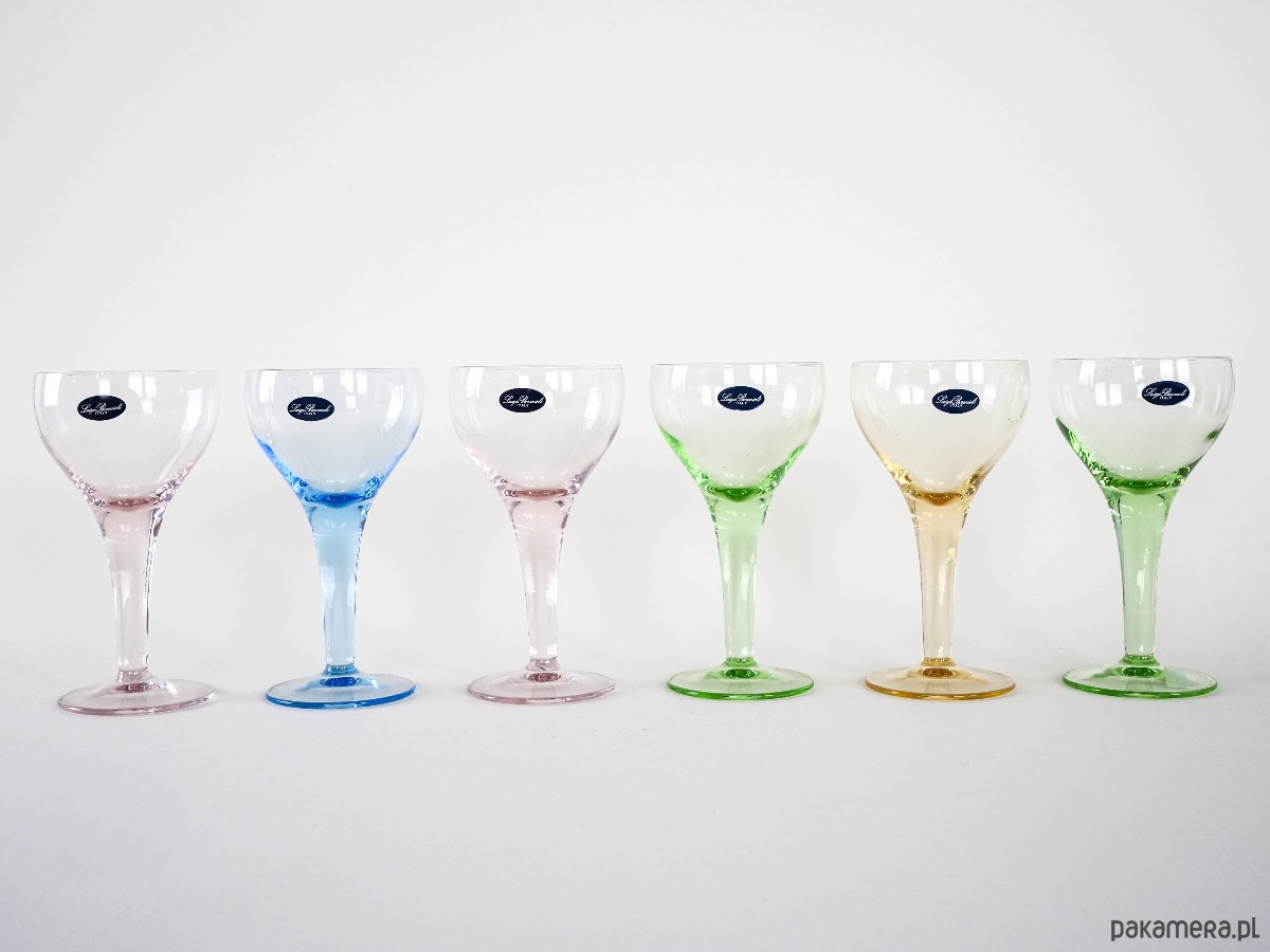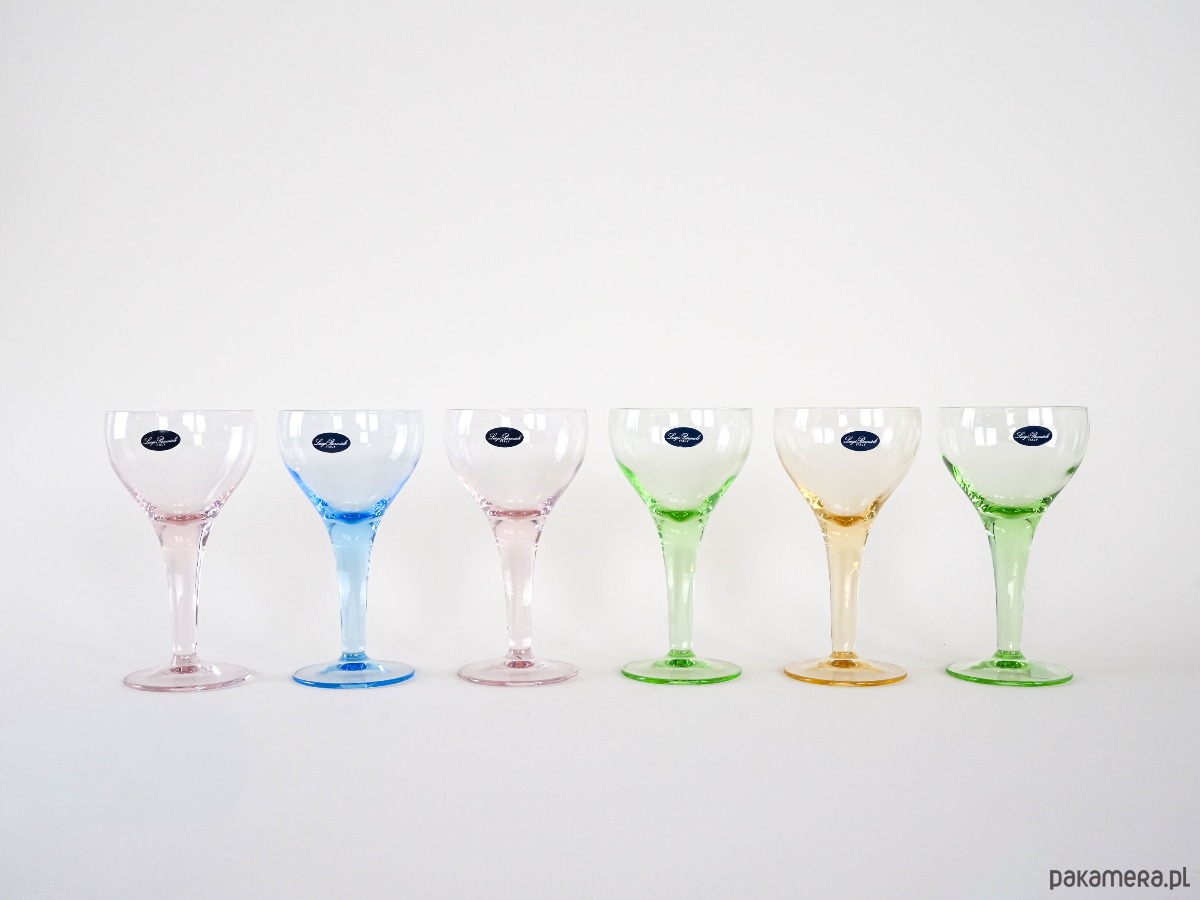 Komplet 6 cięższych, solidnych pucharków z grubszego, kolorowego szkła, idealnych do serwowania deserów – lodów, musów lub sałatek owocowych. Każdy egzemplarz w innym pastelowym odcieniu: różowym, niebieskim, zielonym i żółtym. Na kieliszkach oryginalne naklejki producenta: Luigi Bormioli / Italy.