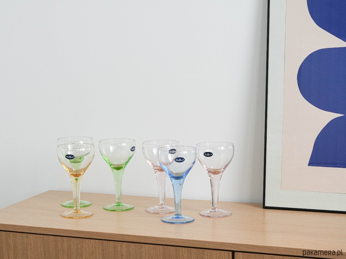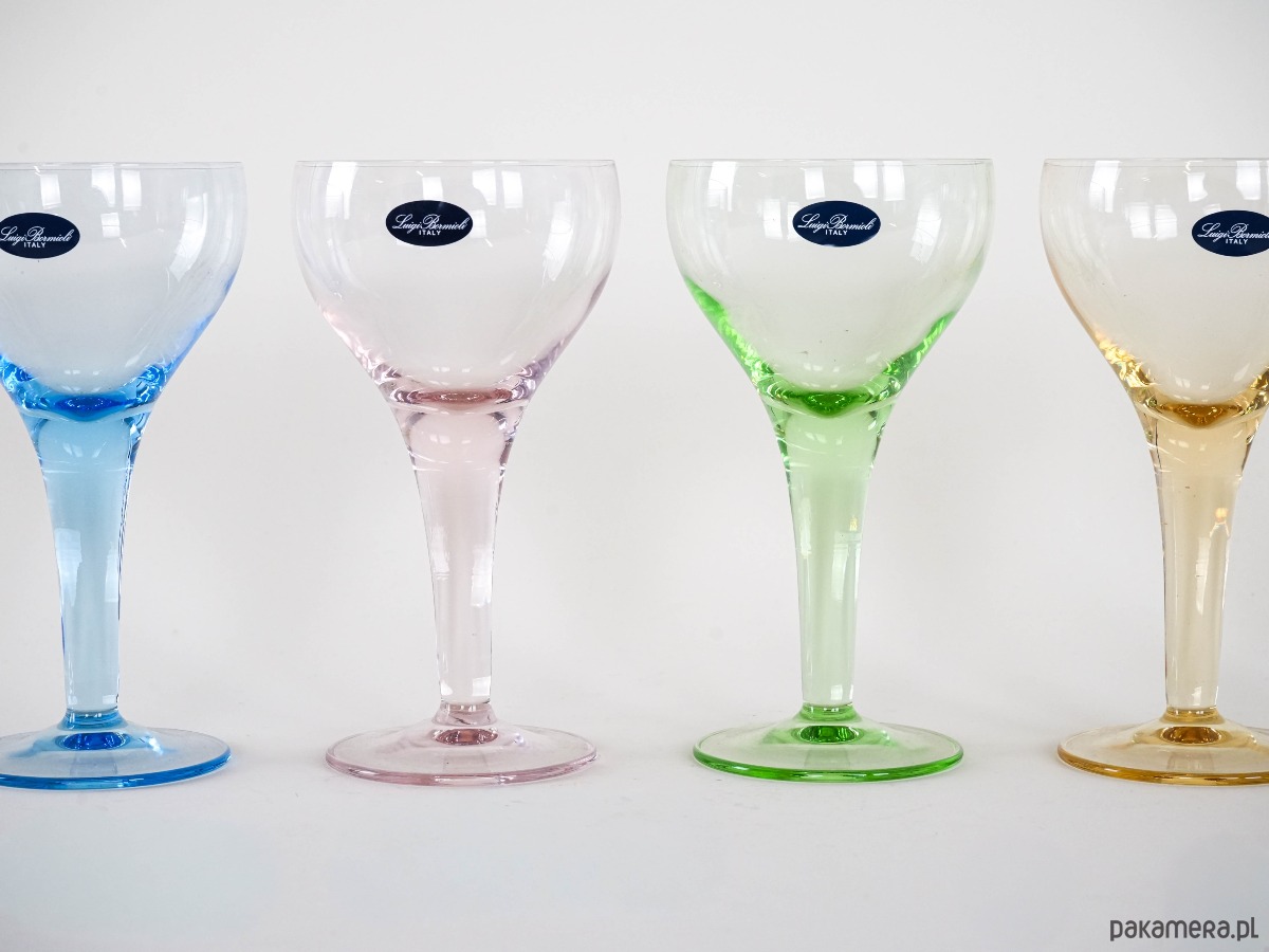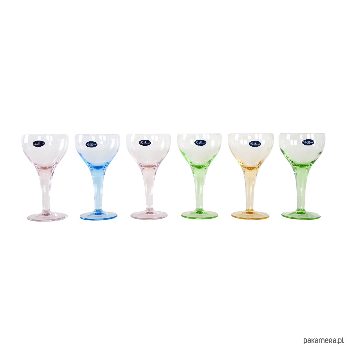 Komplet 6 cięższych, solidnych pucharków z grubszego, kolorowego szkła, idealnych do serwowania deserów – lodów, musów lub sałatek owocowych. Każdy egzemplarz w innym pastelowym odcieniu: różowym, niebieskim, zielonym i żółtym. Na kieliszkach oryginalne naklejki producenta: Luigi Bormioli / Italy.