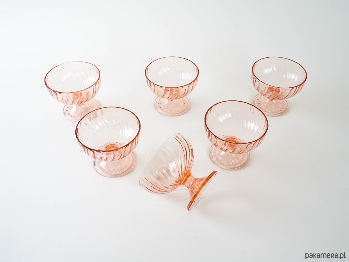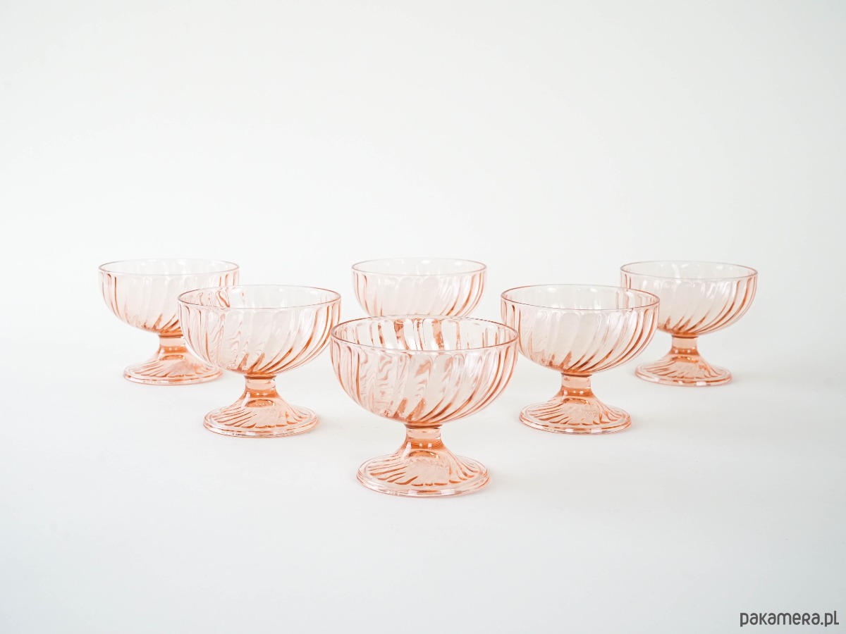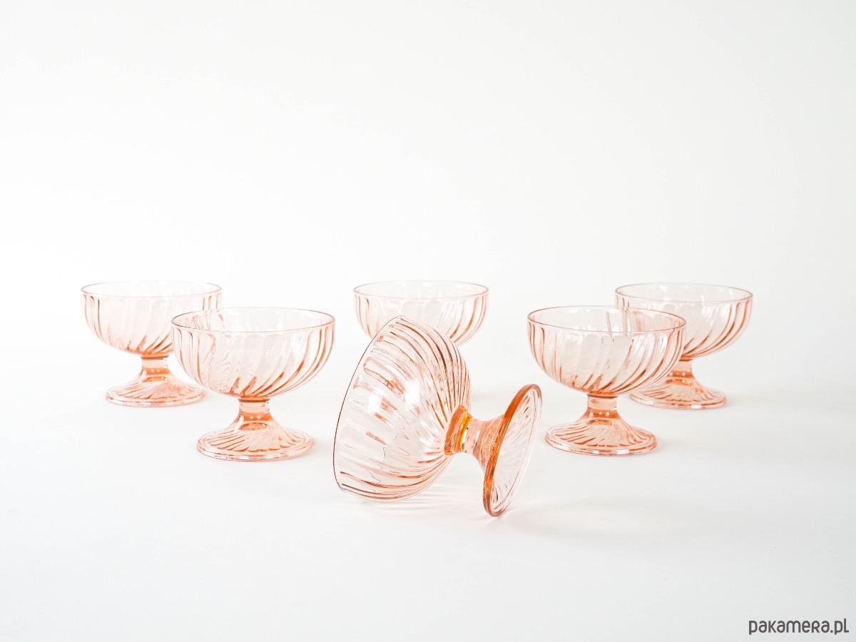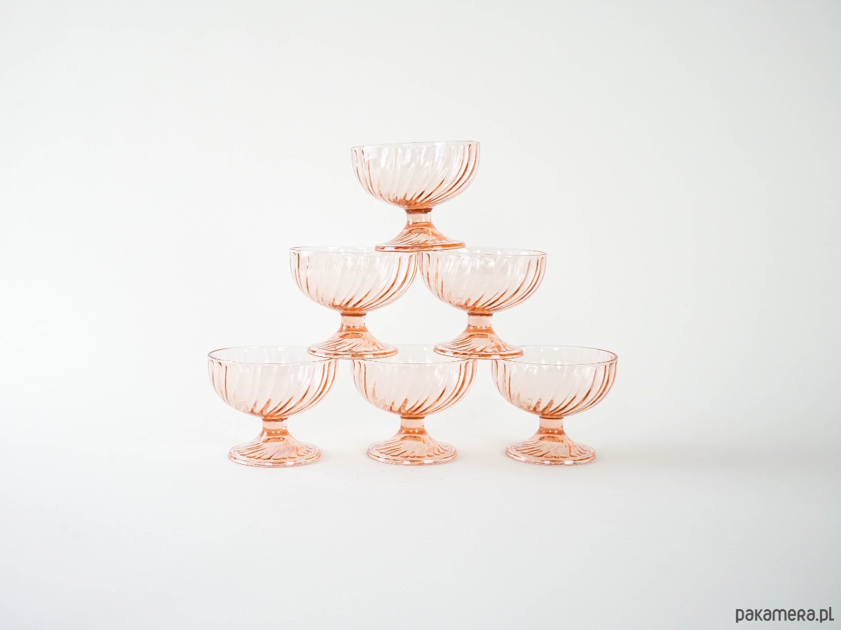 Sześć szklanych pucharków w delikatnym, różowym kolorze. Żłobiona powierzchnia dodaje im uroku i elegancji. Idealne do lodów, owoców lub innych deserów.