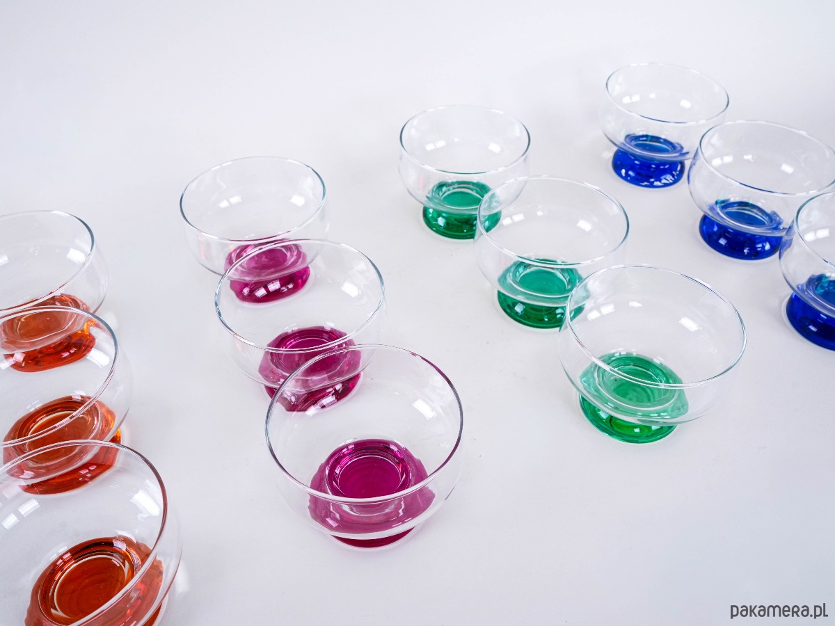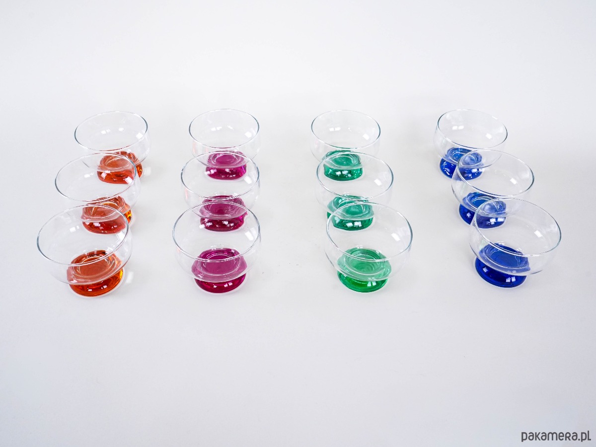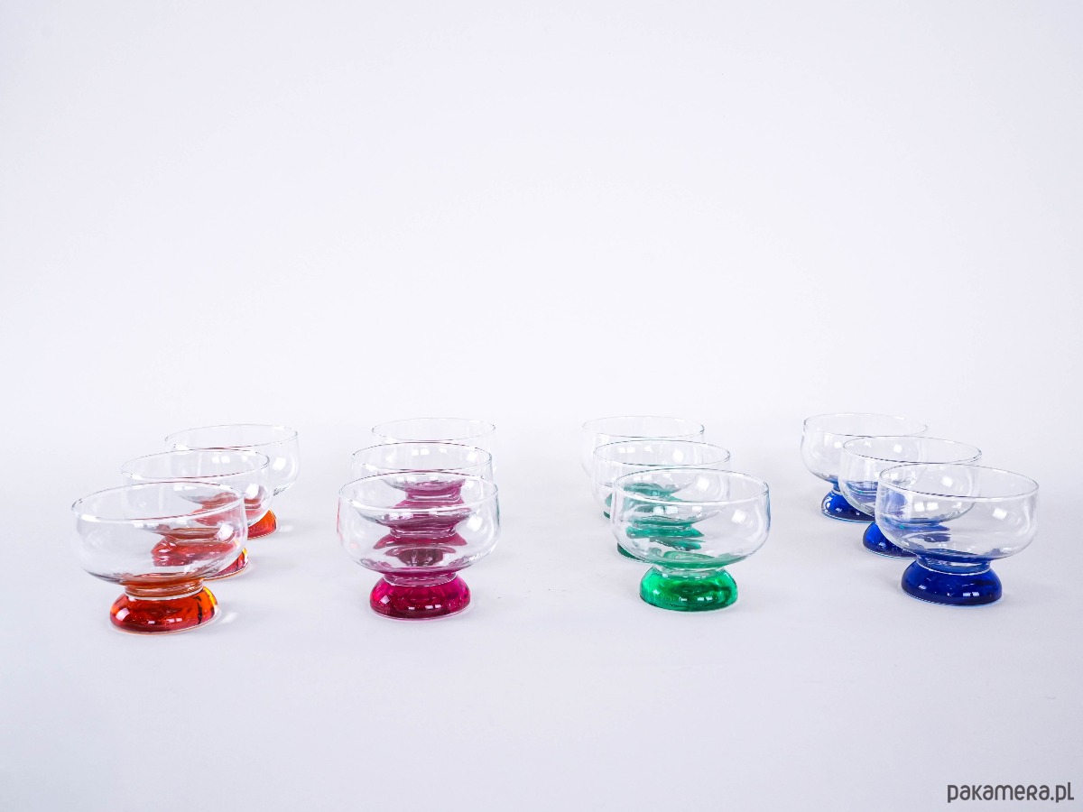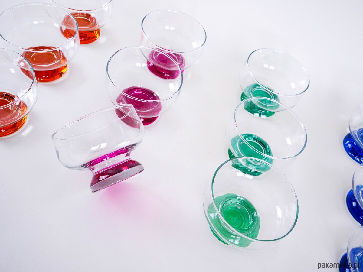 Zestaw 12 kolorowych pucharków vintage z grubym, barwionym szkłem u podstawy – idealne do lodów, deserów lub serwowania przekąsek. Każdy w innym kolorze, co dodaje uroku i zabawy każdej okazji.