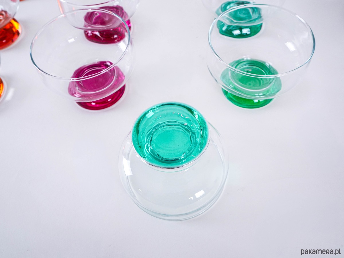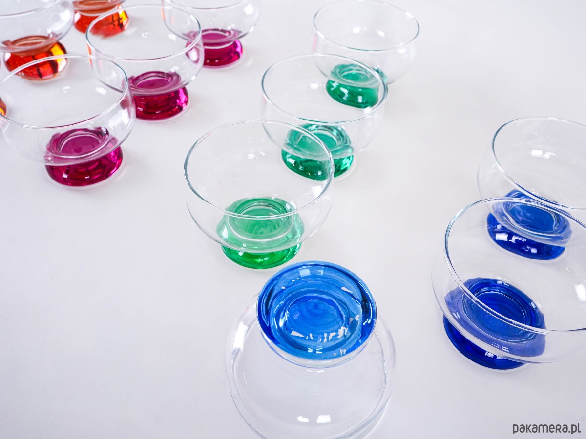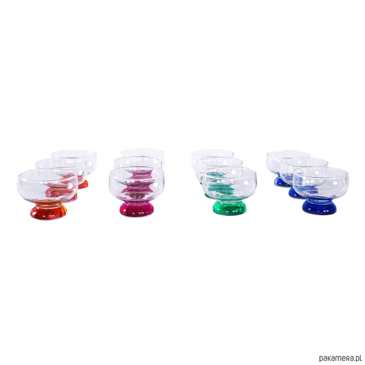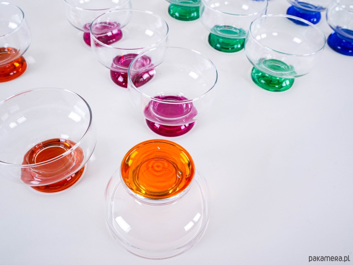 Zestaw 12 kolorowych pucharków vintage z grubym, barwionym szkłem u podstawy – idealne do lodów, deserów lub serwowania przekąsek. Każdy w innym kolorze, co dodaje uroku i zabawy każdej okazji.