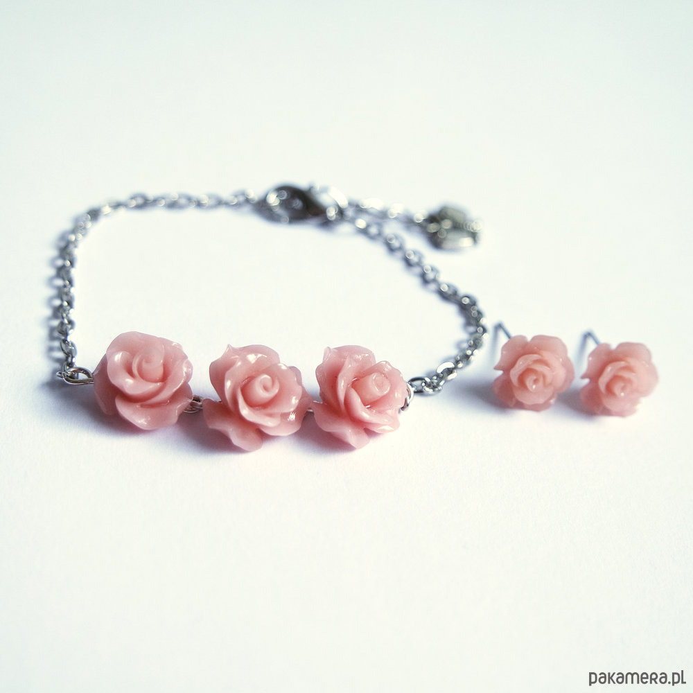 Komplet - Pudrowe różyczki - bransoletka, kolczyki