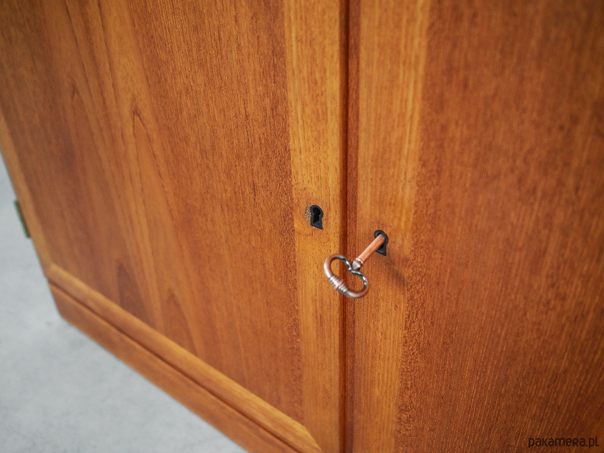 Konstrukcja pokryta jest fornirem tekowym. Powierzchnia po odświeżeniu. Meble zostały umieszczone na drewnianym cokole. Wewnątrz przestrzeń została wypełniona piętnastoma praktycznymi półkami oraz pięcioma szufladami. Trzynaście półek posiada możliwość regulacji wysokości. W dolnych szafkach znajduje się pięć regulowanych półek oraz pięć pojemnych szufladek. Meble posiadają wygodne rozwiązanie drzwi otwieranych, dzięki czemu mamy nieograniczony dostęp do ich wnętrza. Dodatkowym atutem jest uniwersalny barek, wypełniony czterema szufladkami oraz dwiema regulowanymi półkami. Meble posiadają otwory w płycie tylnej, przeznaczone na kable. Klucz w zestawie.
