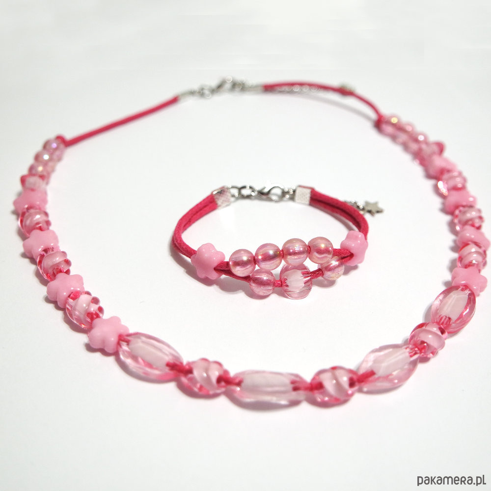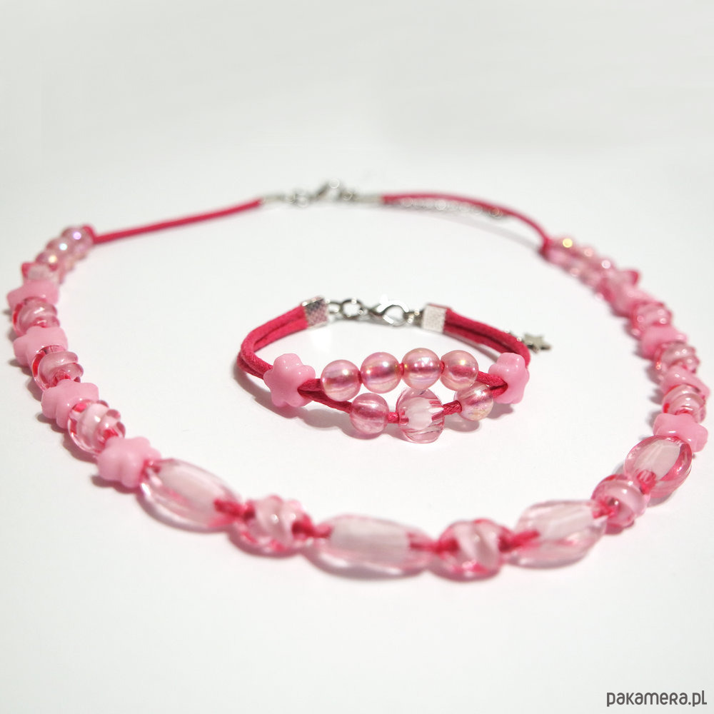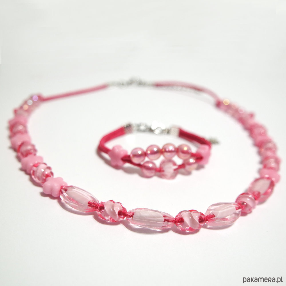 Komplet zrobiony jest ze sznureczka woskowanego oraz akrylowych koralików.