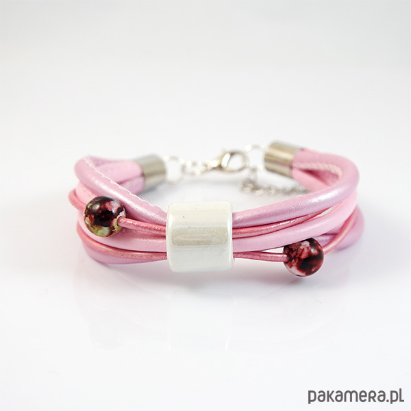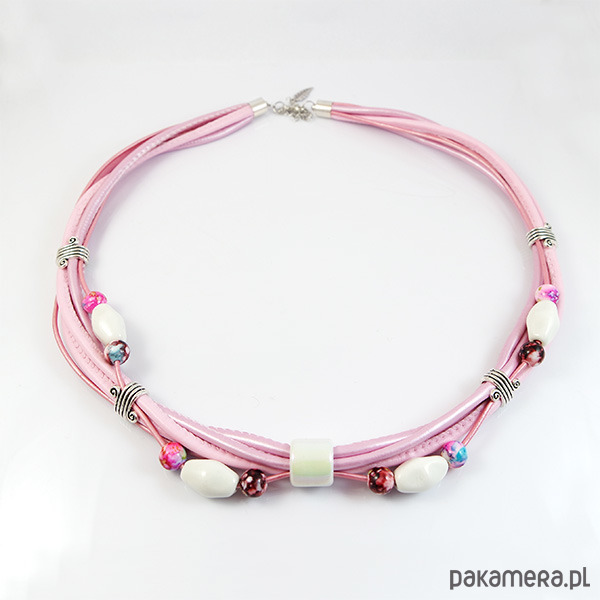Komplet wykonany jest z rzemieni z eko-skóry i skóry naturalnej oraz ceramicznych koralików.