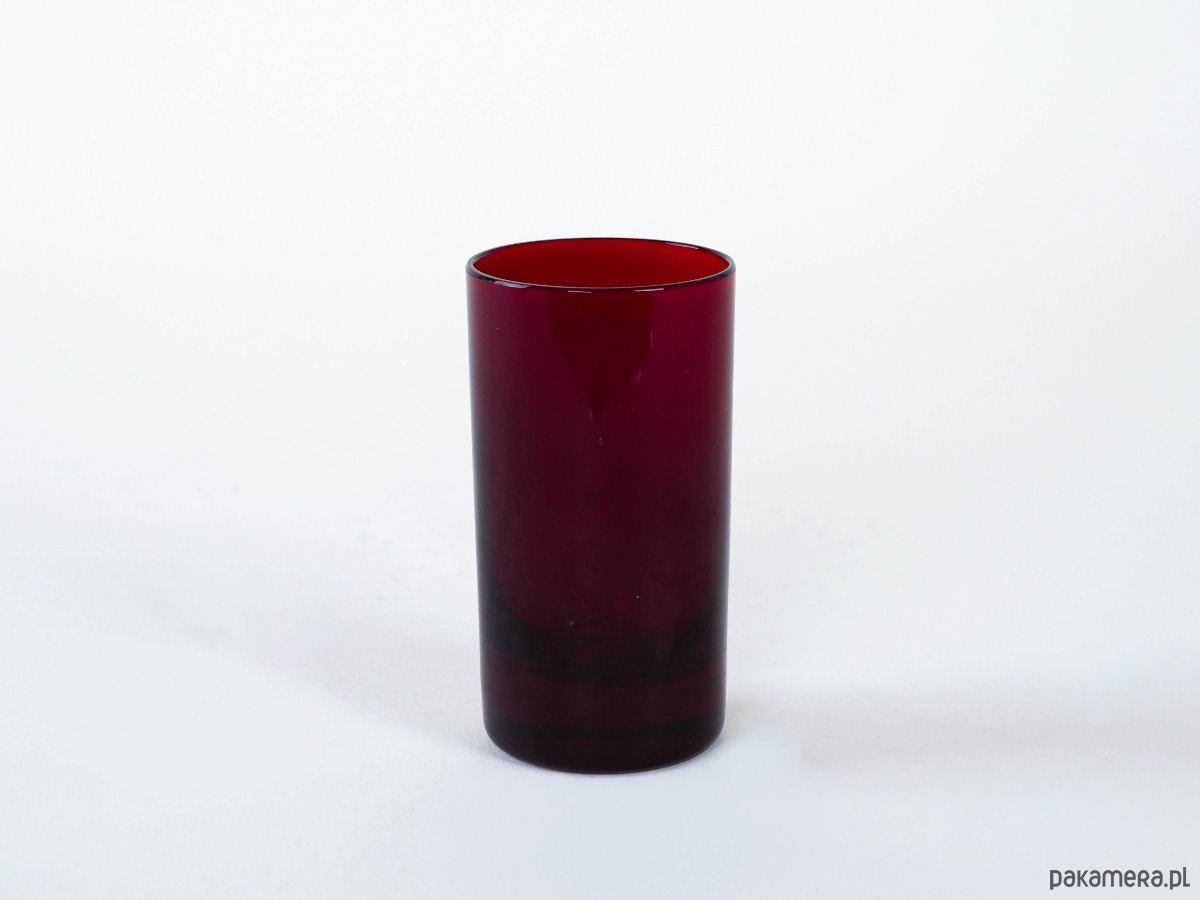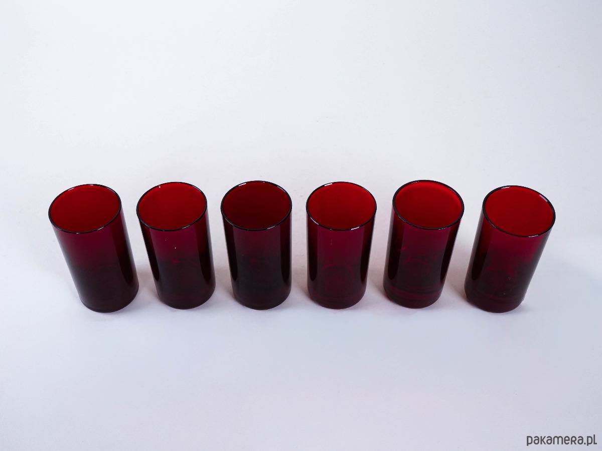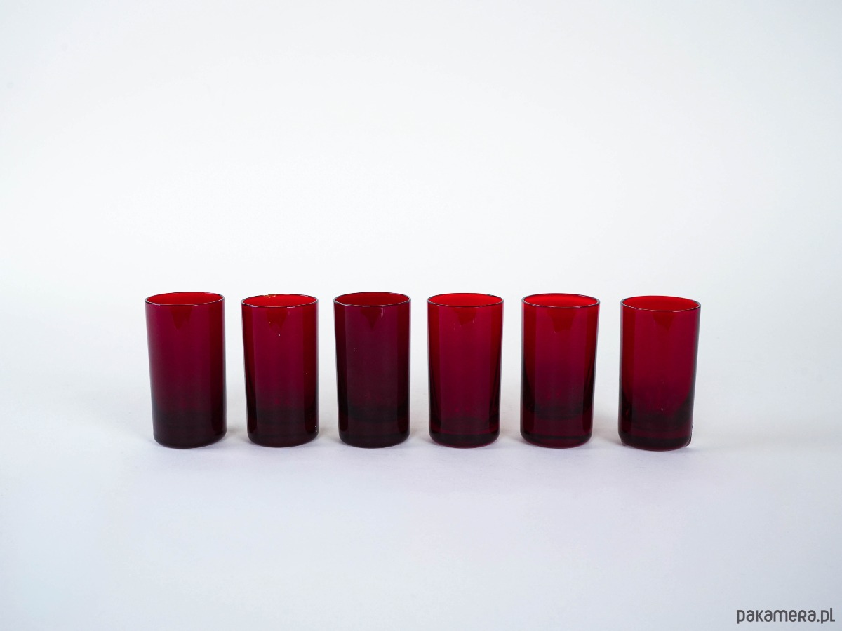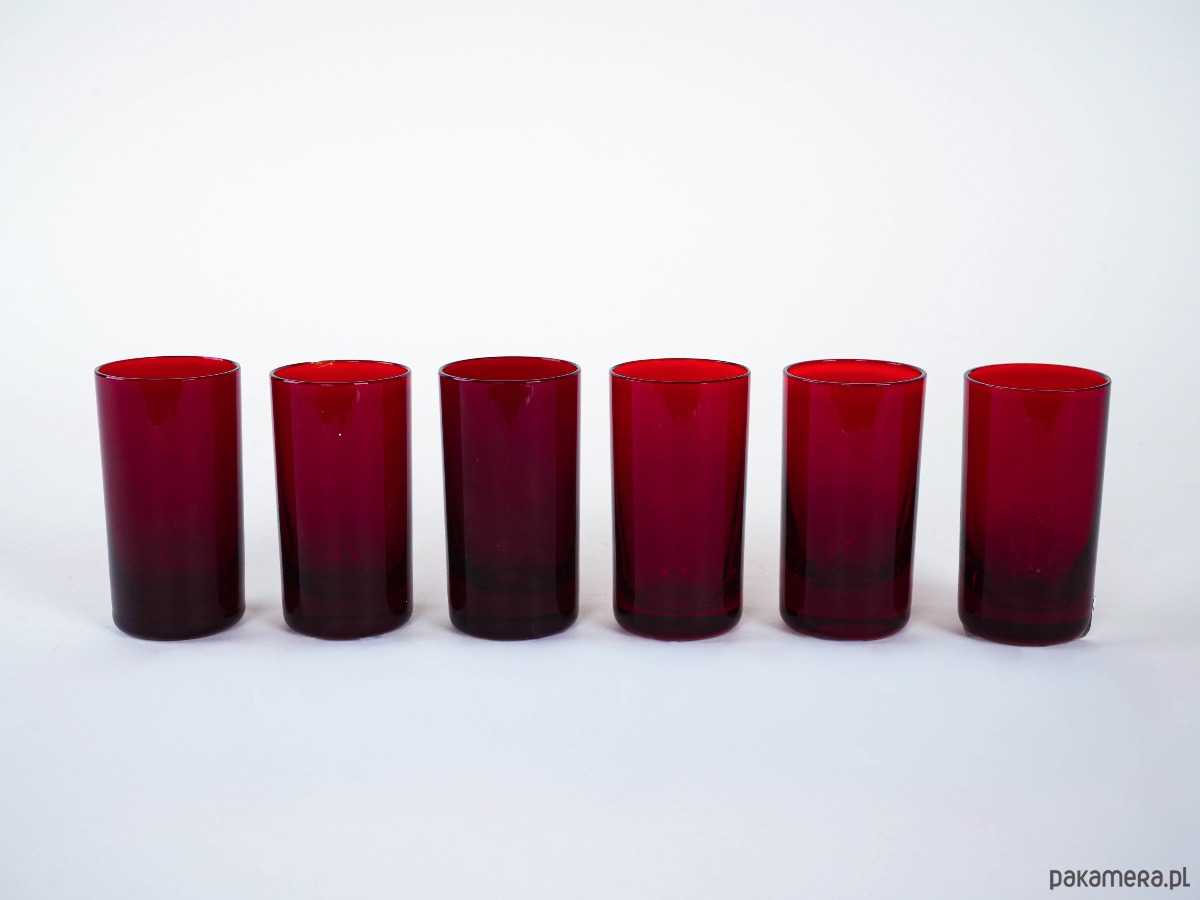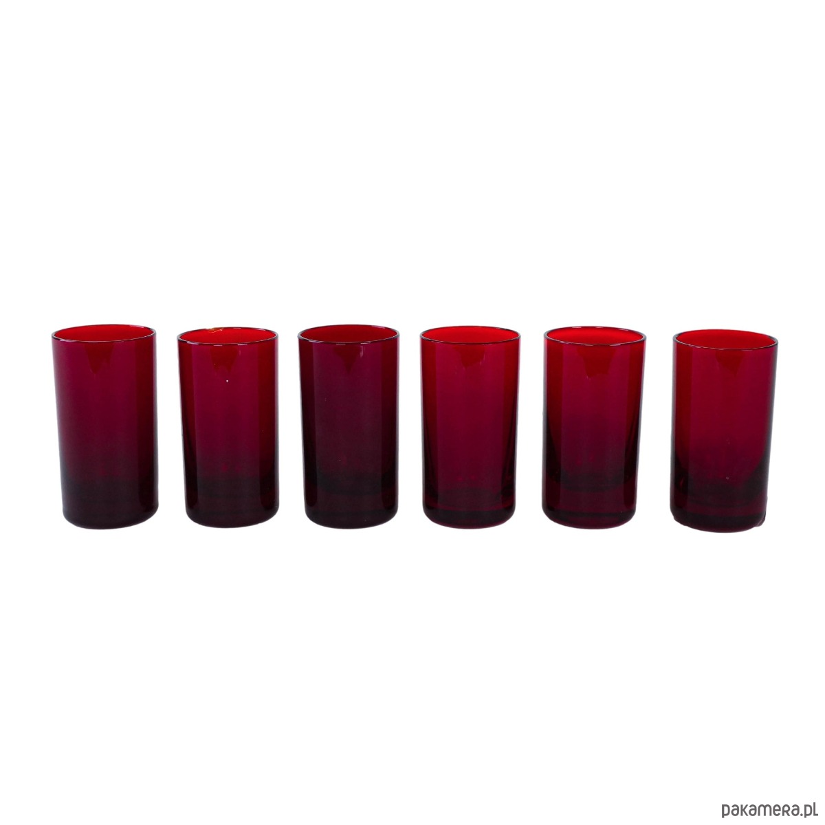 Zestaw sześciu szklanek wykonanych ze szkła w intensywnym, rubinowym kolorze. Prosta, cylindryczna forma i nasycona barwa sprawiają, że szkło prezentuje się niezwykle elegancko i ponadczasowo. Idealne do serwowania napojów, a także jako element dekoracyjny w kolekcji szkła vintage.