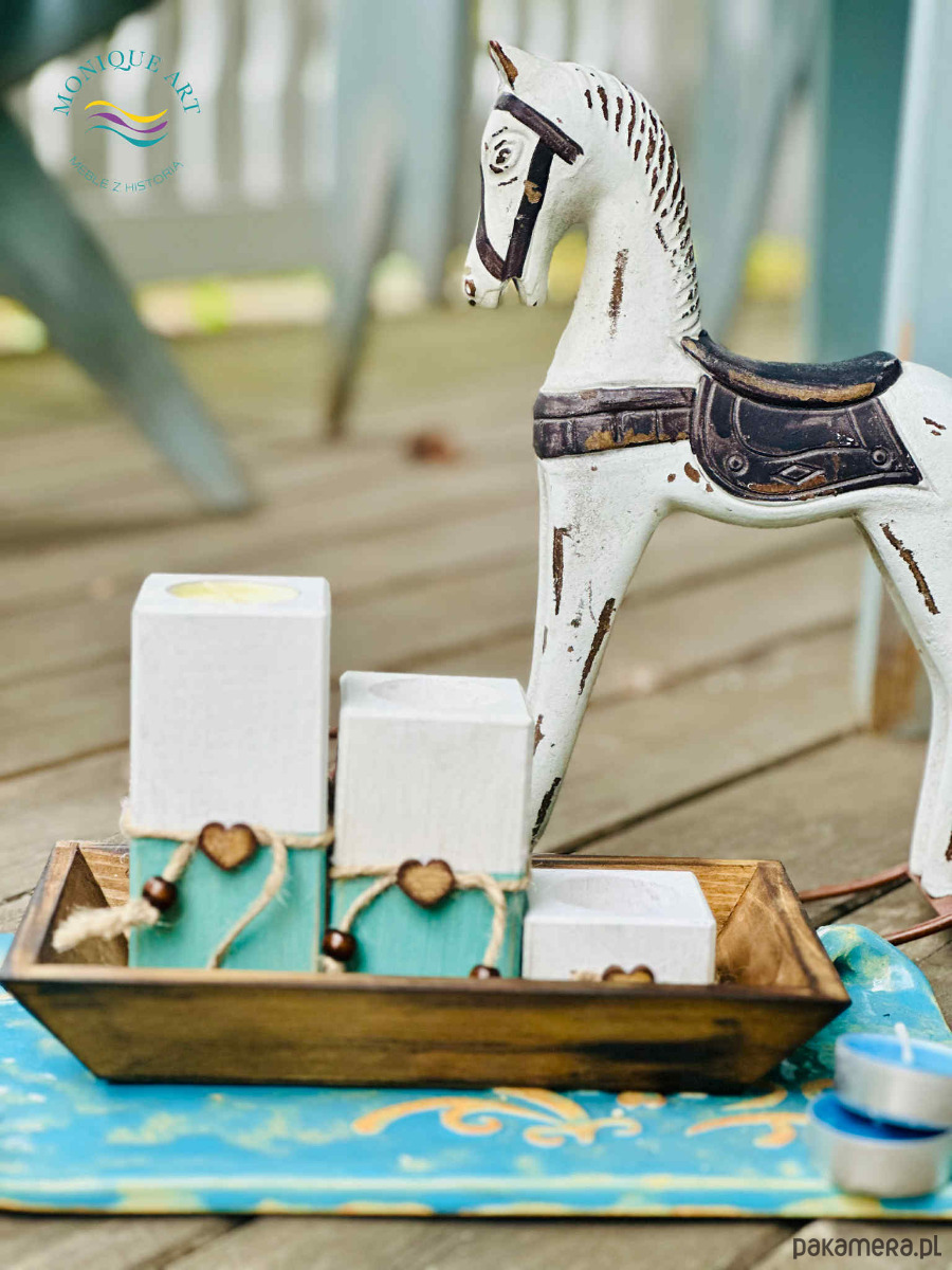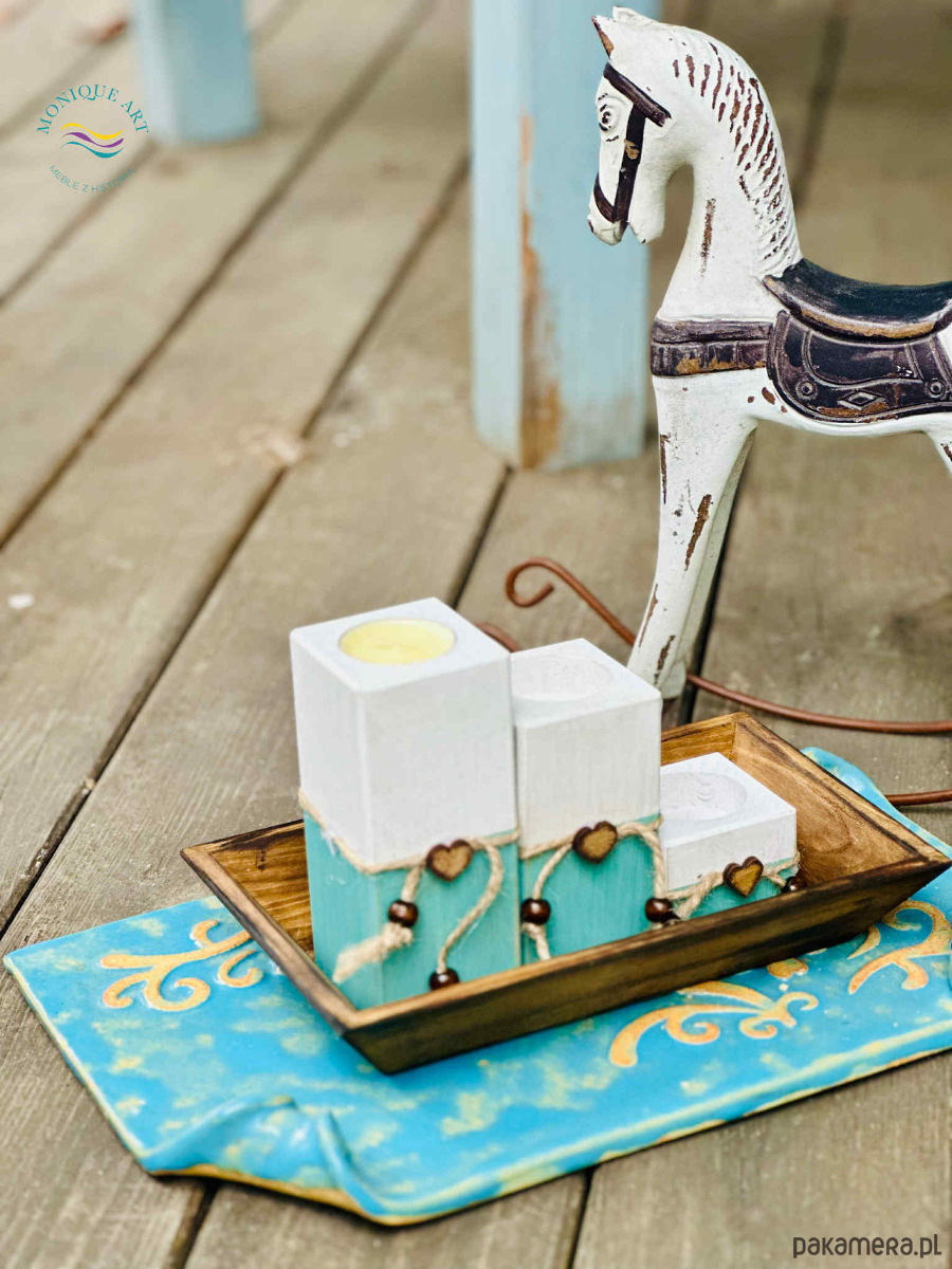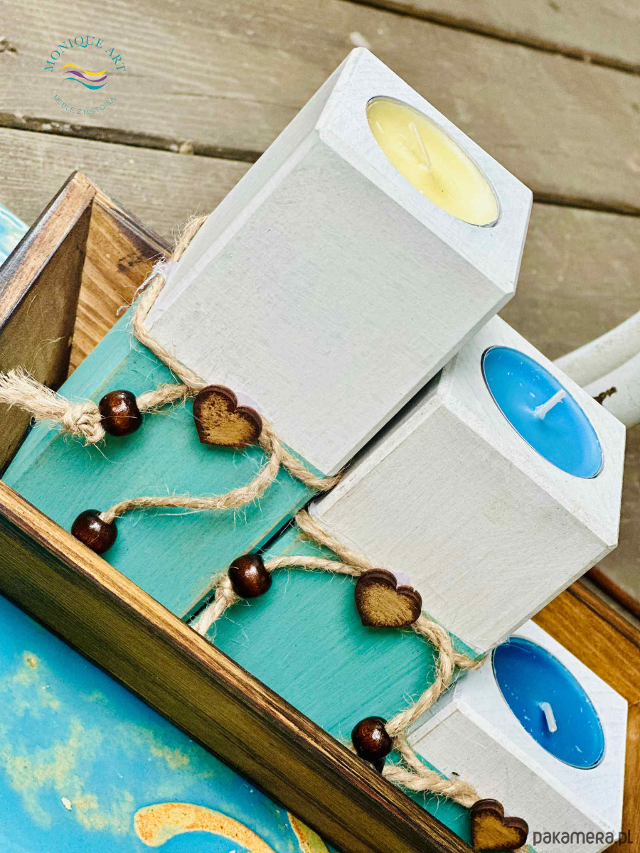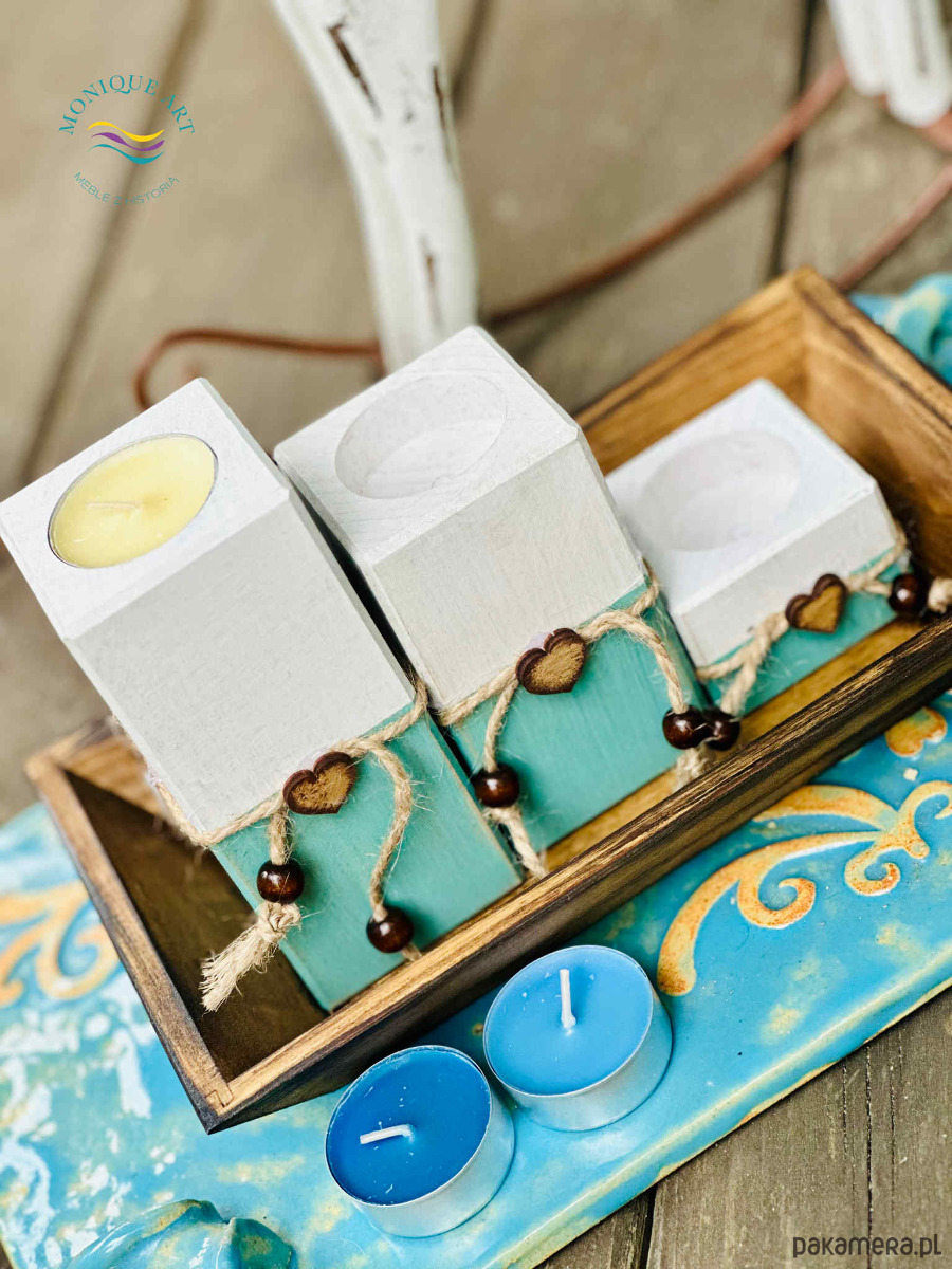 Komplet drewnianych świeczników z ozdobnymi dekorami (sznurek, serca, korale)