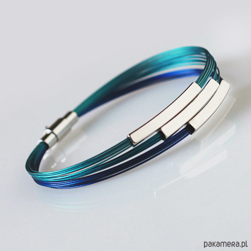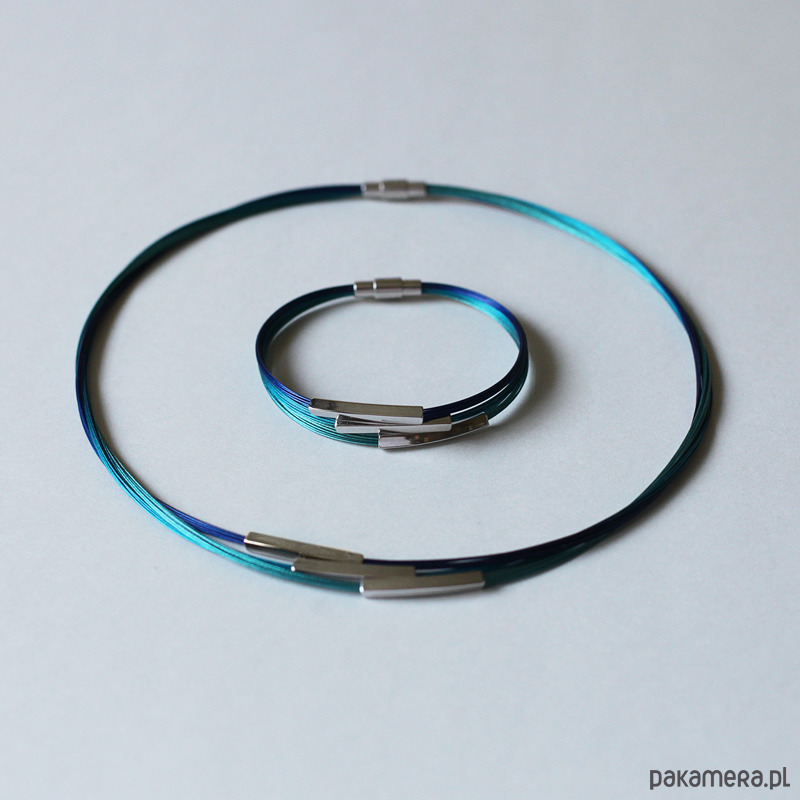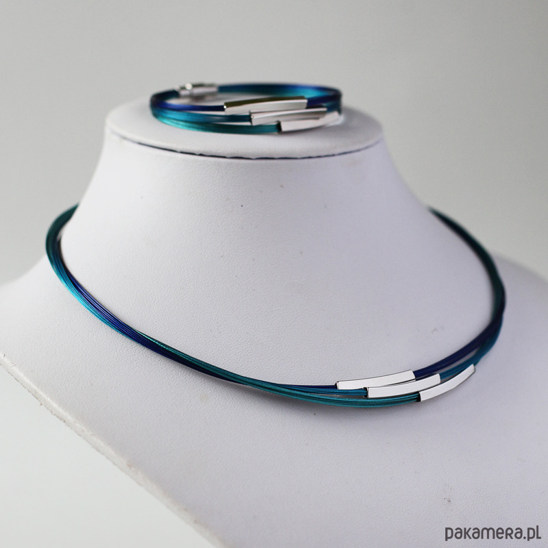 Komplet wykonany na bazie linki jubilerskiej, sztabki z mosiądzu platerowanego rodem.