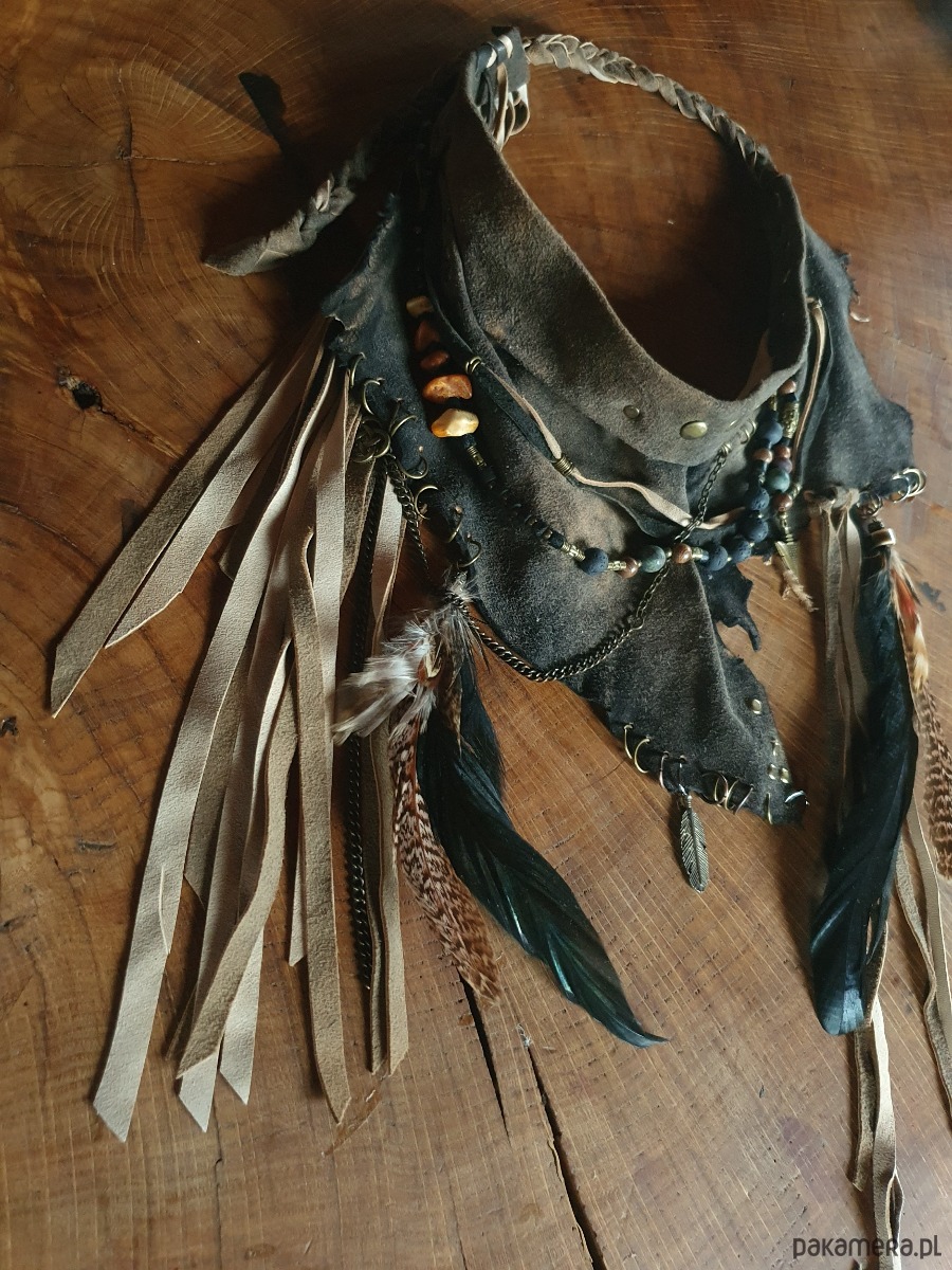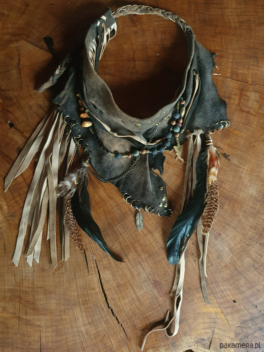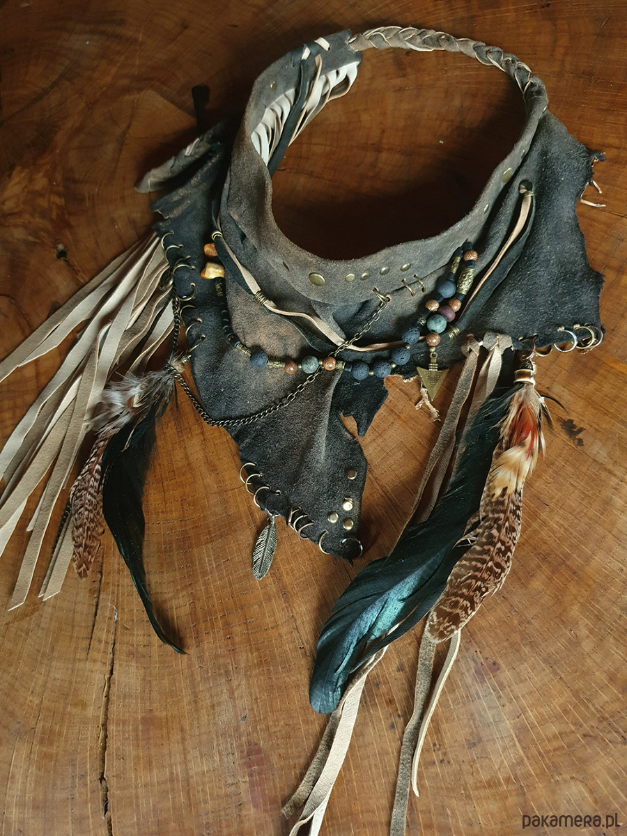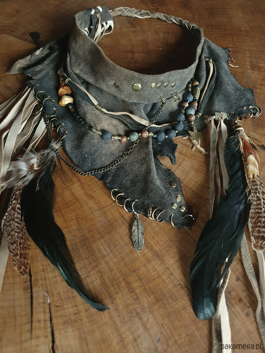 Naszyjnik wykonany ze skóry, naturalnych ptasich piór, koralików drewnianych i metalowych, oraz bursztynów, malachitów i lawy wulkanicznej..