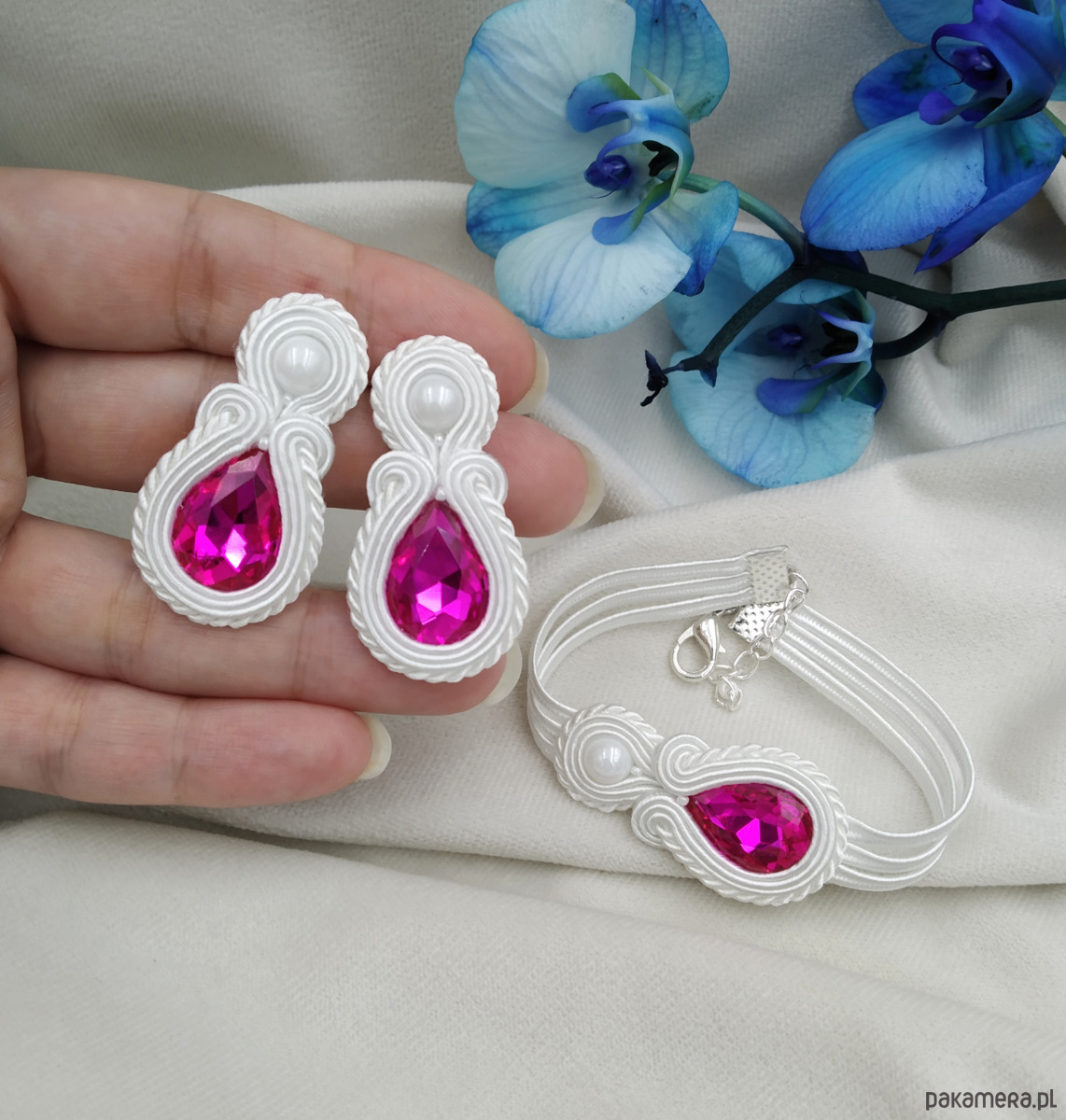 Kryształy w kolorze Fuchsia, satynowe czeskie perły, śnieżnobiały sutasz - ale ten model może powstać w każdym dowolnym kolorze - zarówno sutaszu, jak i kryształów - mam szeroką paletę barw, kilkadziesiąt odcieni.
