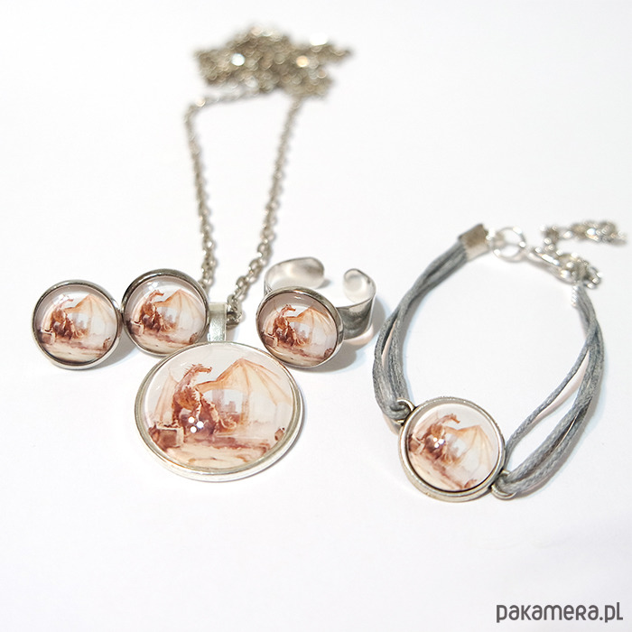 Komplet składa się z naszyjnika, kolczyków sztyftów, pierścionka i bransoletki.