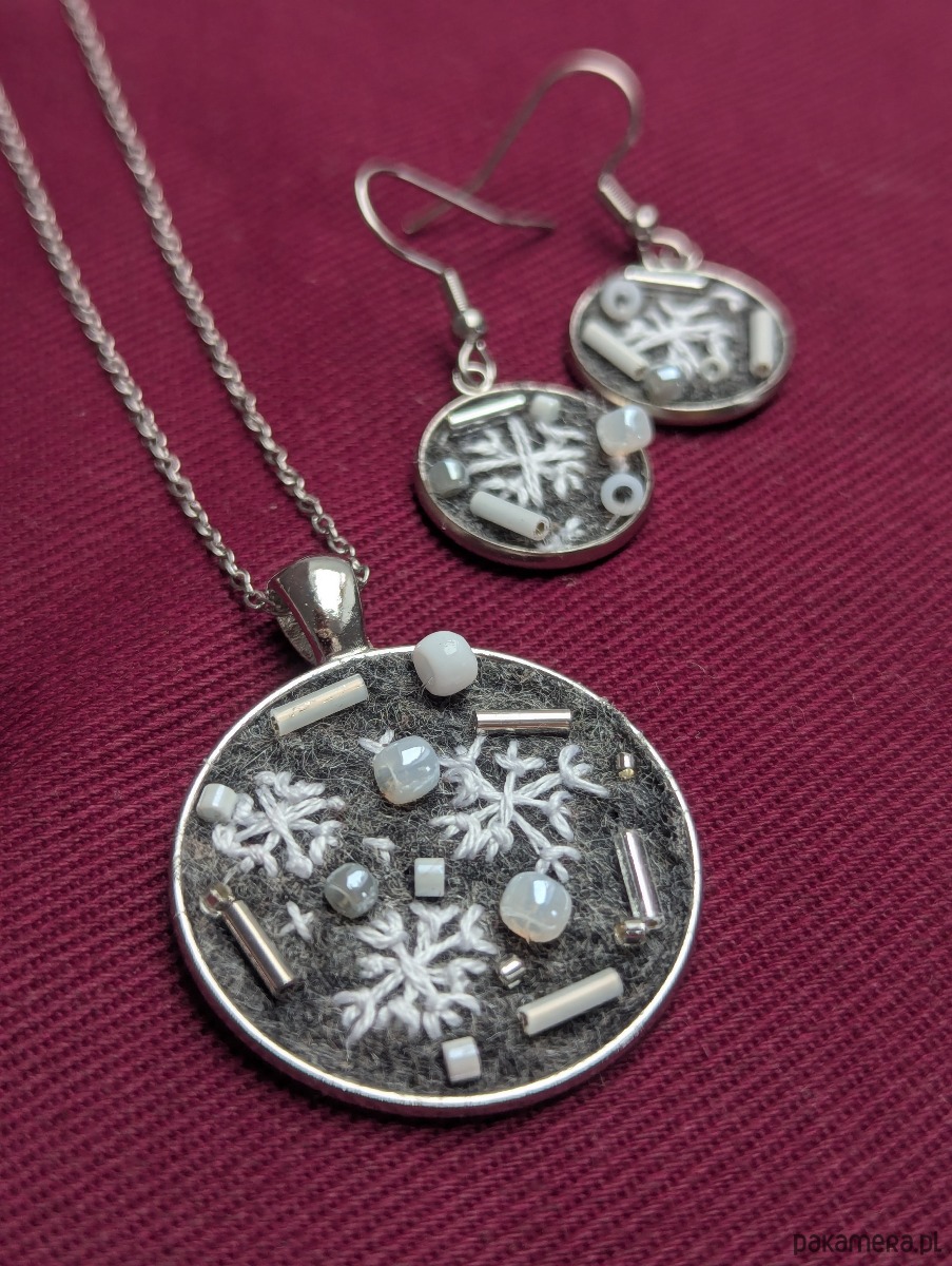 KOMPLET Śnieżynki - ręcznie haftowane kolczyki i naszyjnik