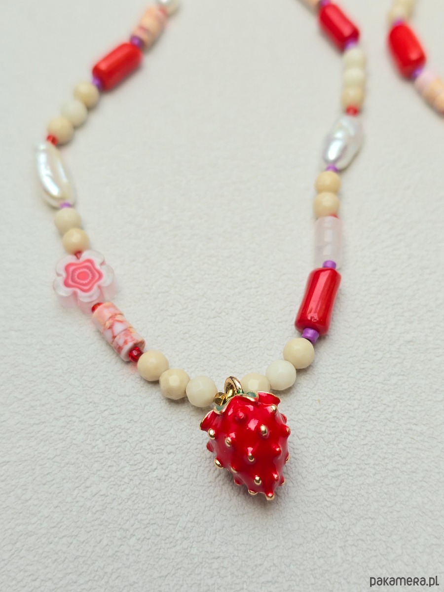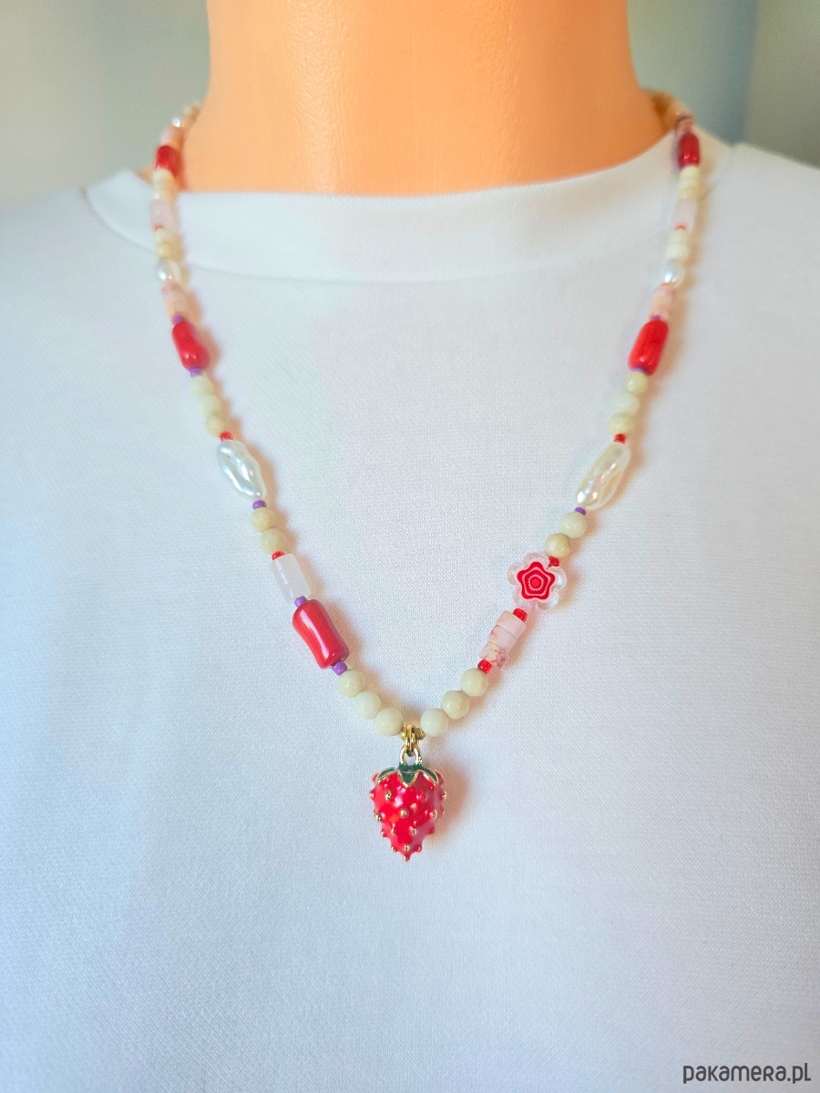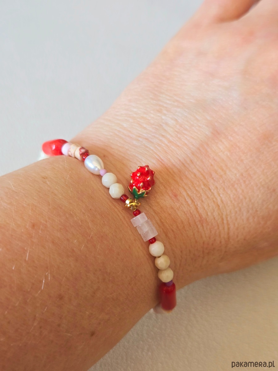Wykorzystane kamienie to: kamień rzeczny, czerwony koral, kwarc różowy, perły naturalne, różowy howlit.