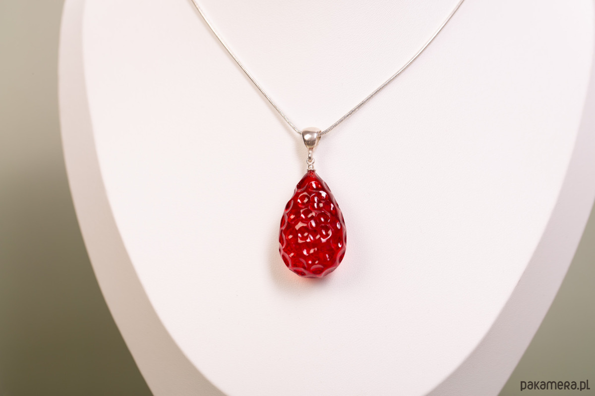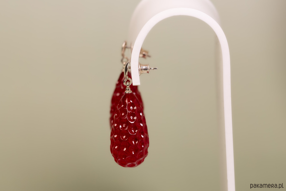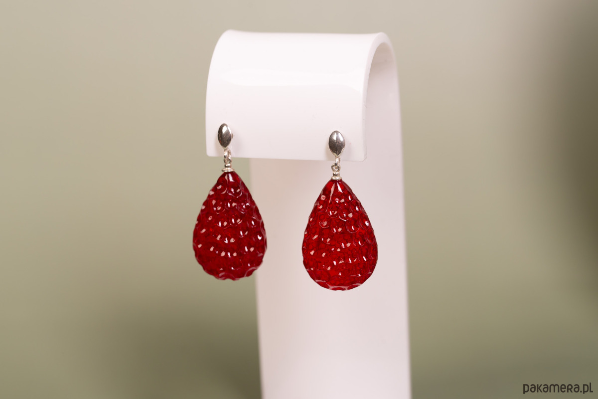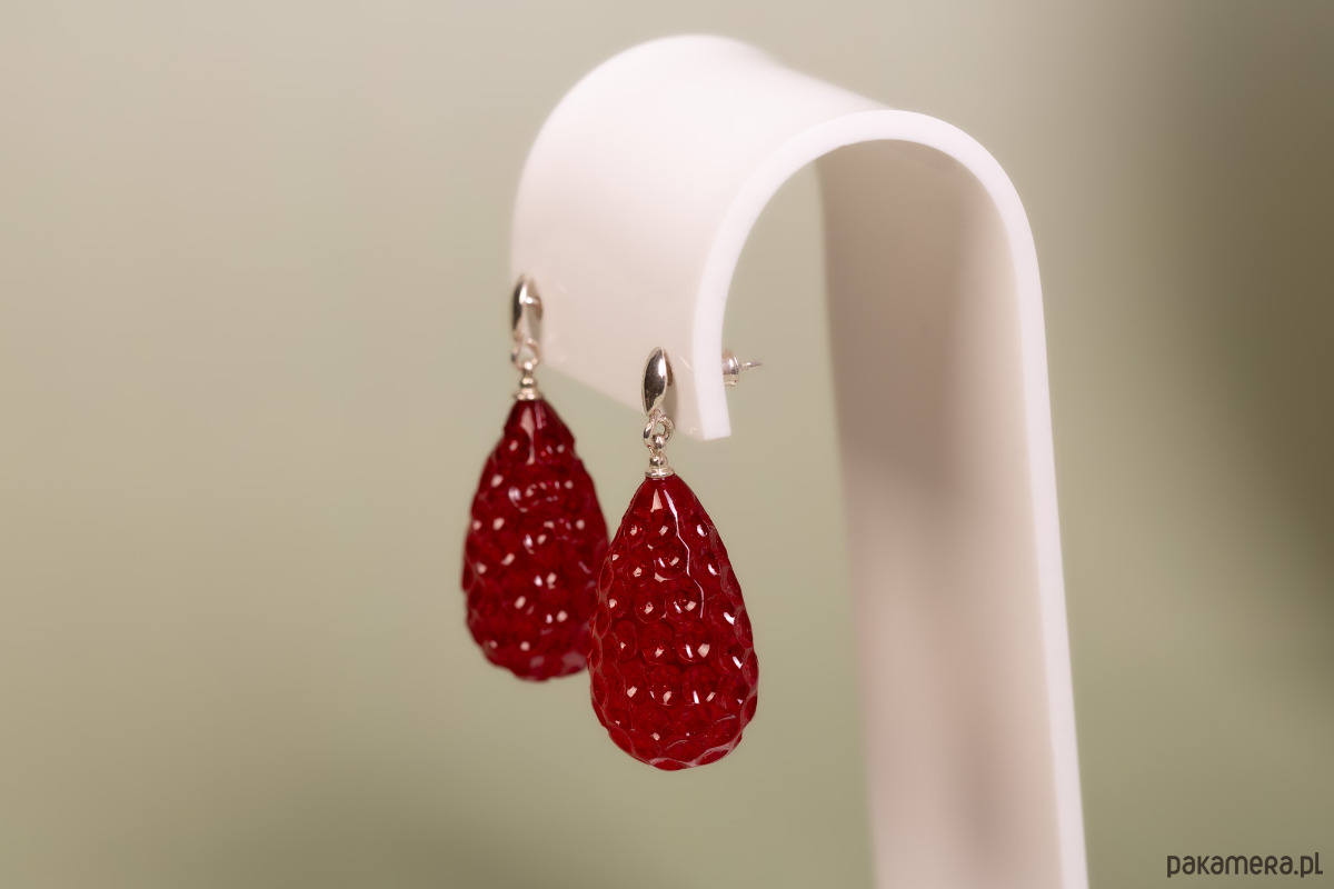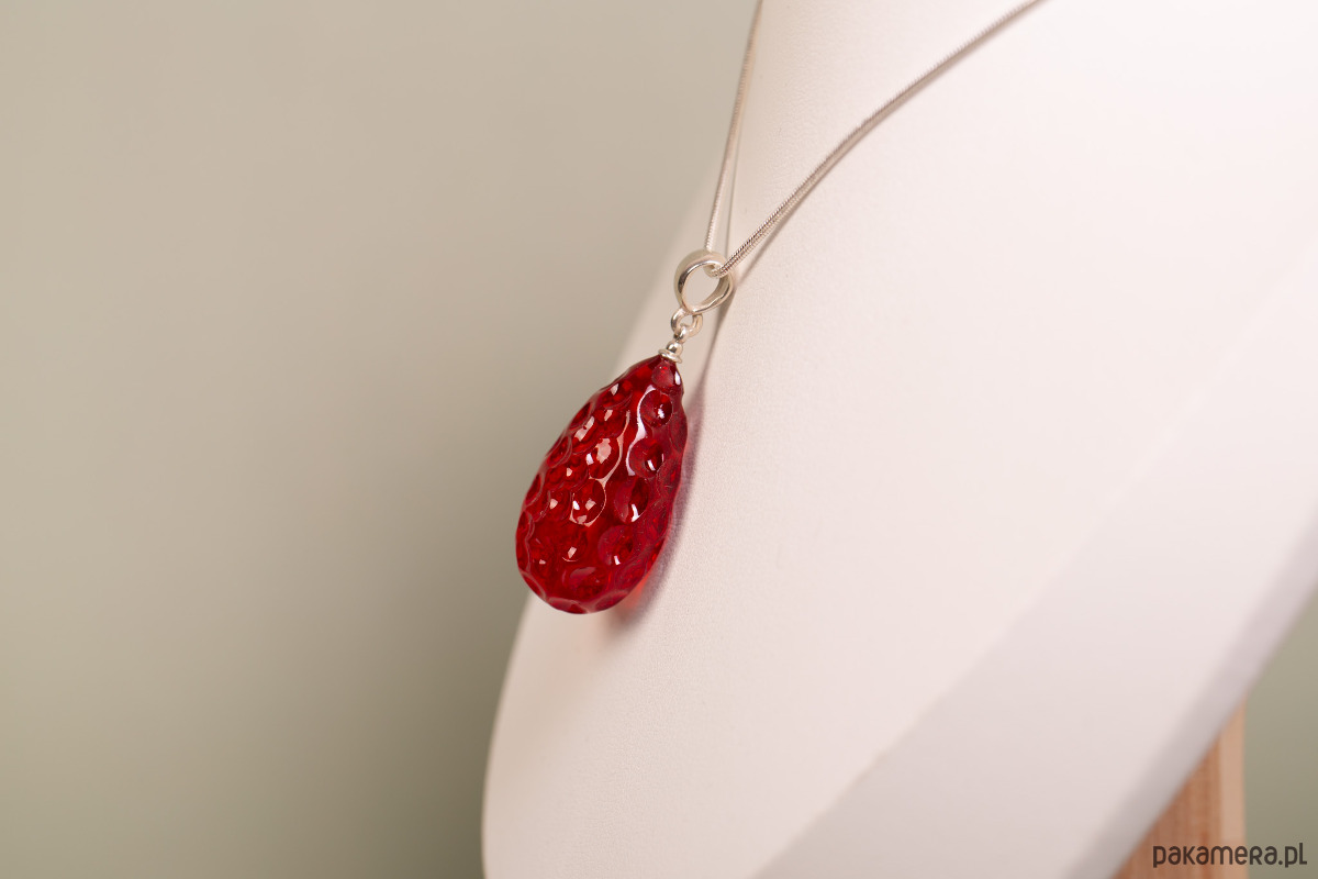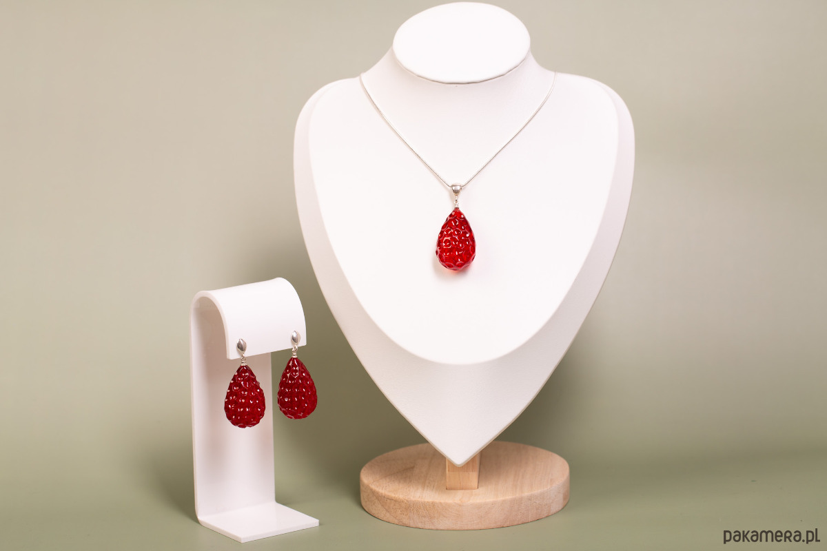 Artystyczny zestaw składający się z wisiorka oraz kolczyków na sztyfcie, wykonany z bursztynu bałtyckiego barwionego na intensywny, soczysty odcień czerwieni. Bursztyny zostały ręcznie wyrzeźbione, dzięki czemu ich trójwymiarowa faktura oraz kształt do złudzenia przypominają dojrzałe owoce malin. To radosna i energetyczna biżuteria o unikatowym charakterze.