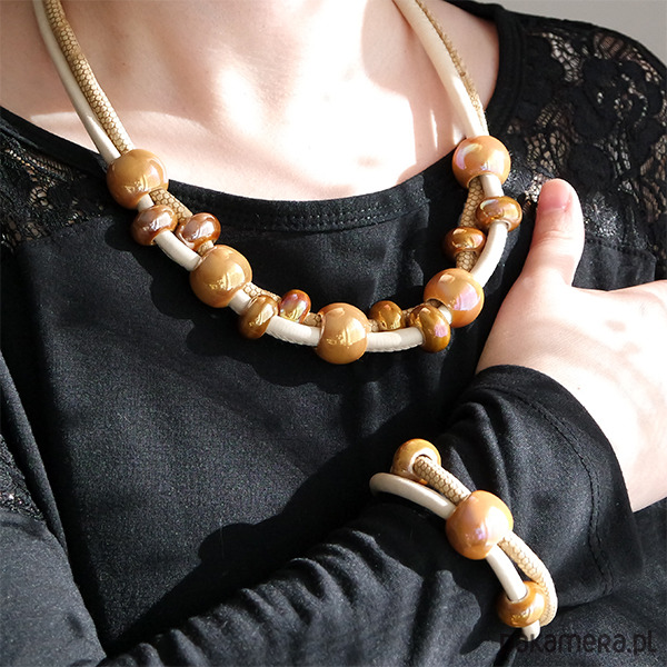 Komplet wykonany jest z rzemieni z eko-skóry oraz ceramicznych koralików.