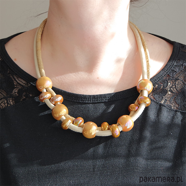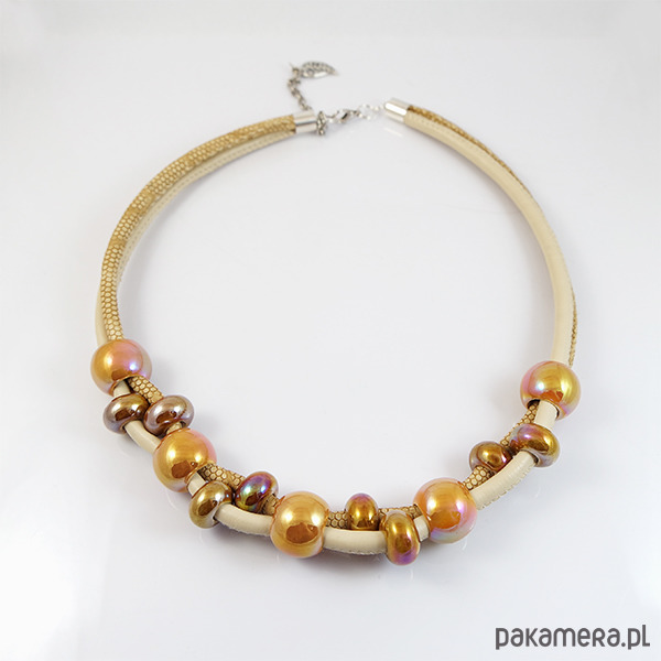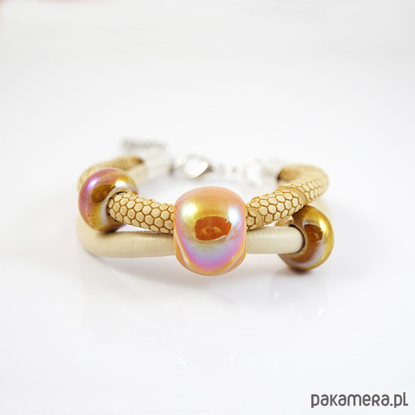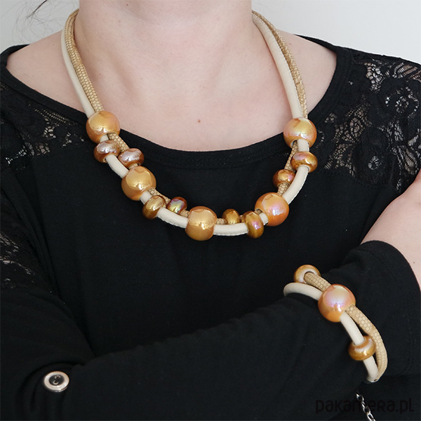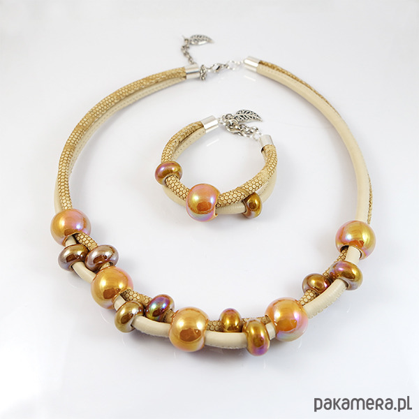 Komplet wykonany jest z rzemieni z eko-skóry oraz ceramicznych koralików.