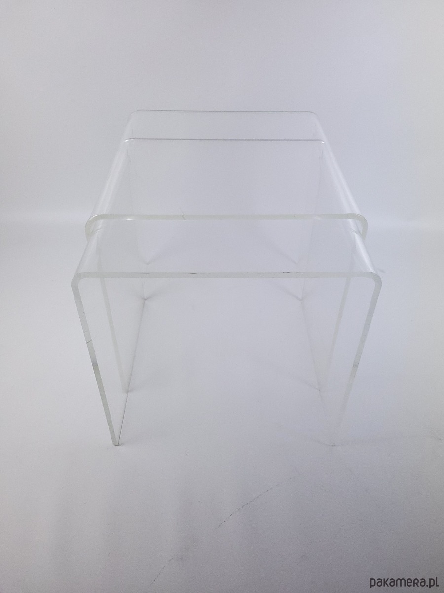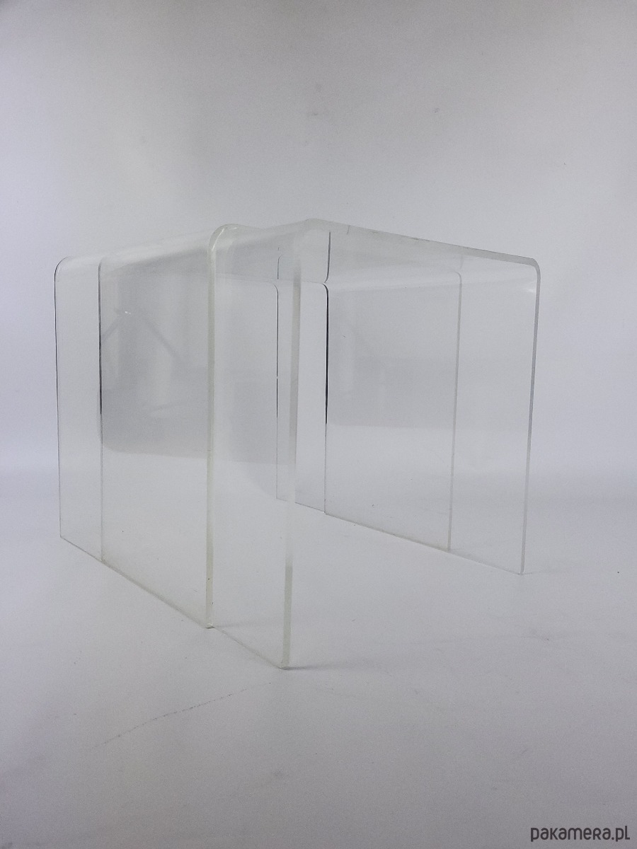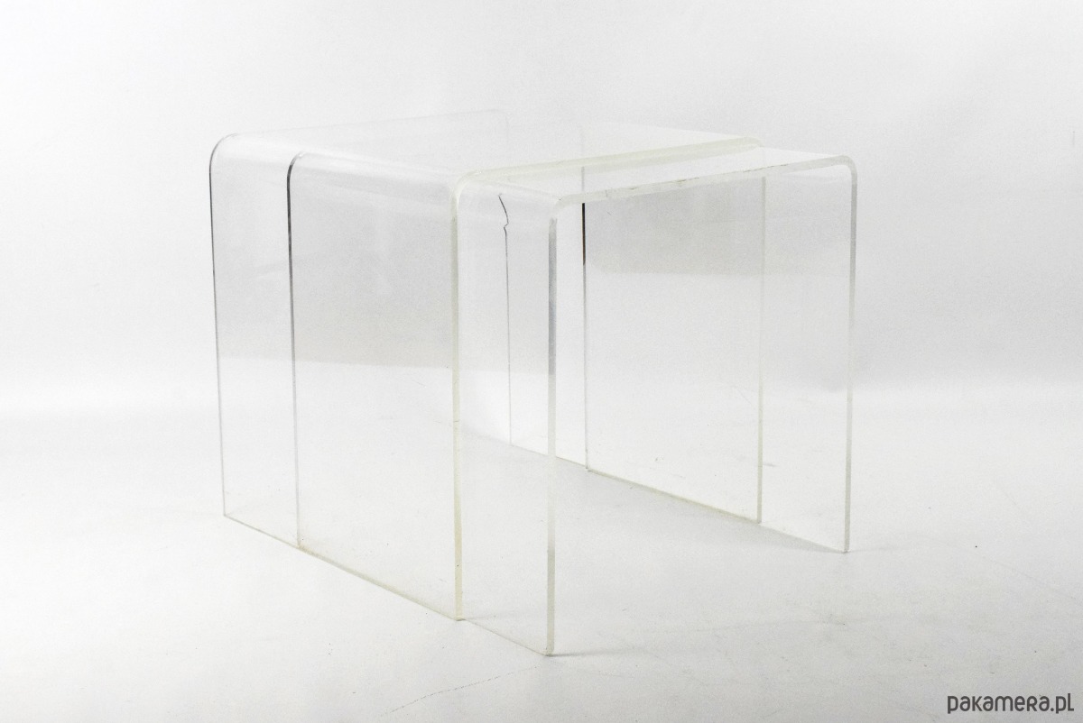 Komplet stolików wykonanych z plexi z lat 70. Stoliki w stanie dobrym posiadają niewielkie rysy.