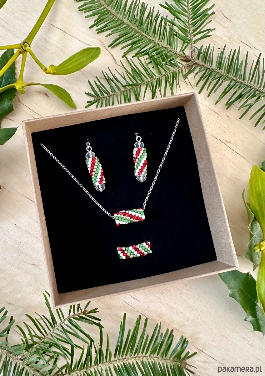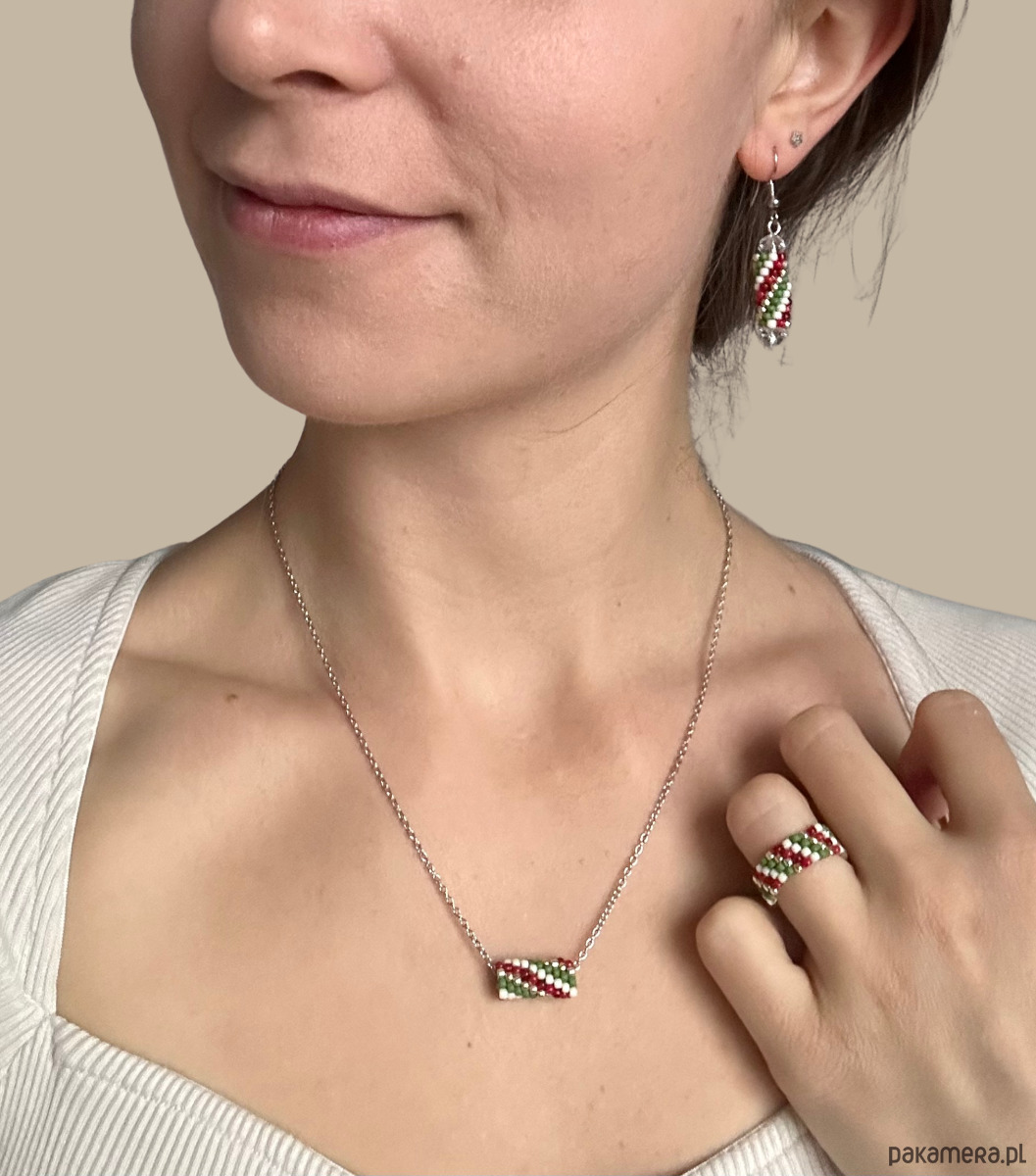Komplet świątecznej biżuterii naszyjnik kolczyki pierścionek