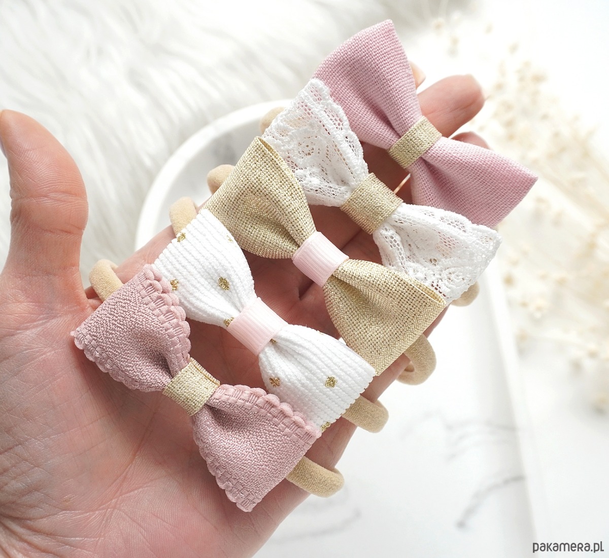 Kokardki wykonane z bawełny, tiulu, lnu i koronki.