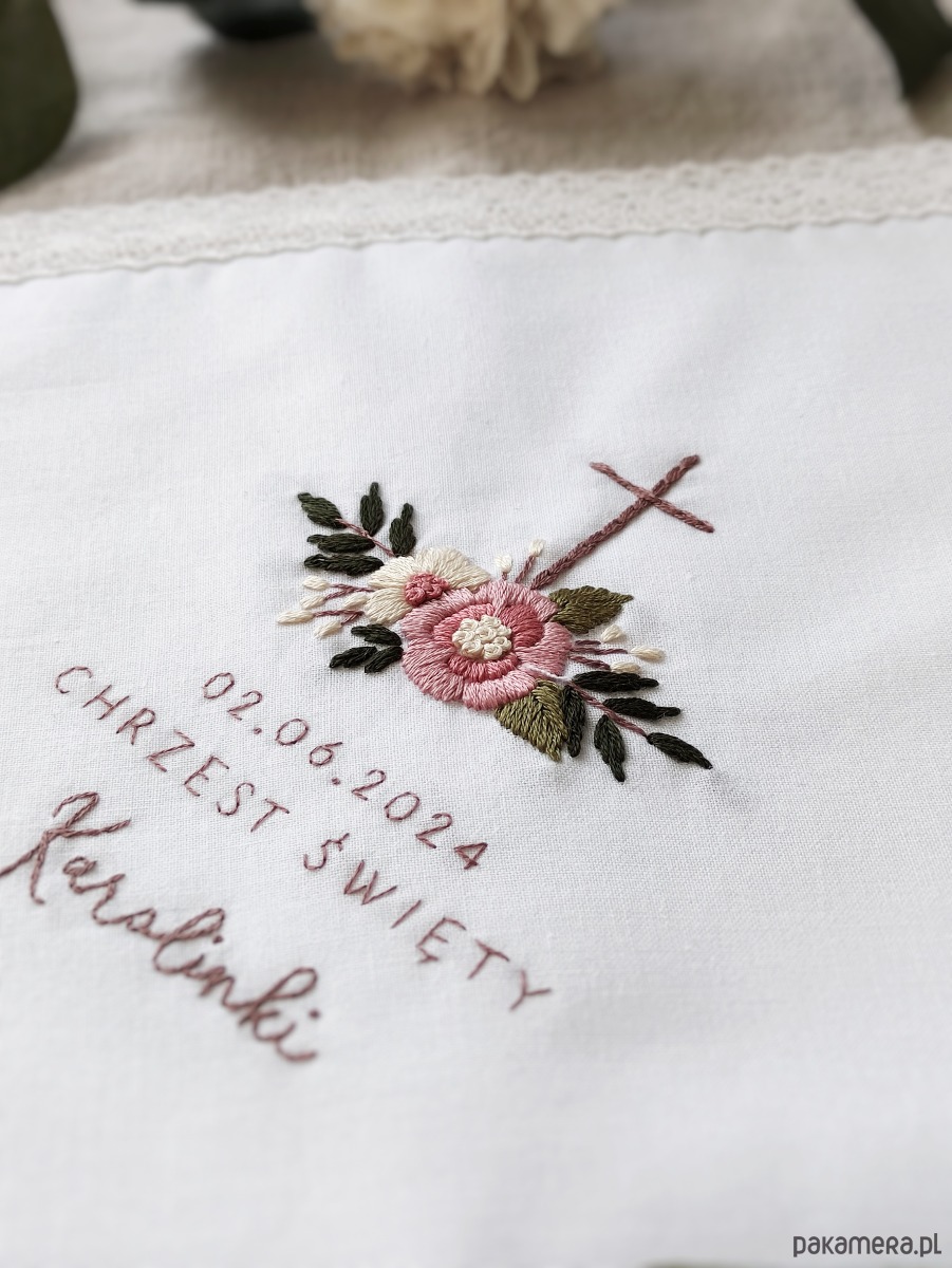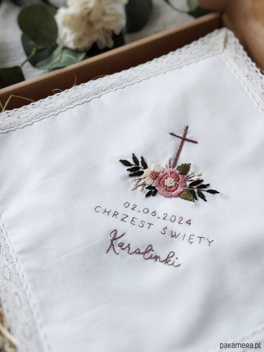 Kwadratowa szatka do Chrztu z haftem kwiatowym i personalizacją.