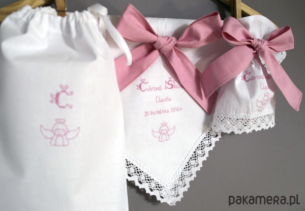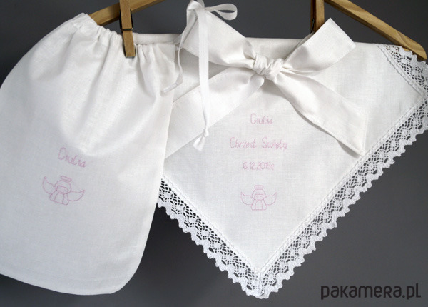 Szatka z szeroką koronką (około 30/30 cm), okapnik na świecę i woreczek - wszystkie elementy haftowane ręcznie.