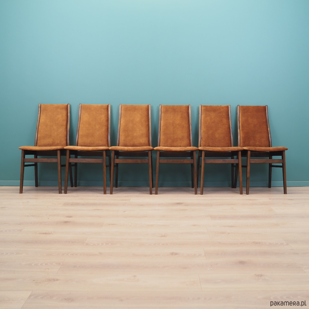 Komplet sześciu krzeseł wykonanych w latach 60-tych, produkcja duńska.