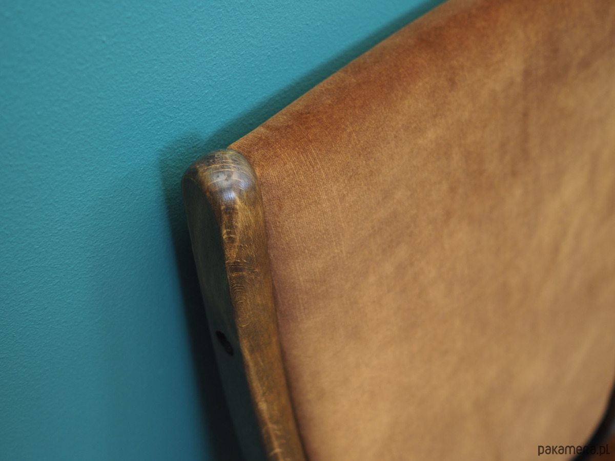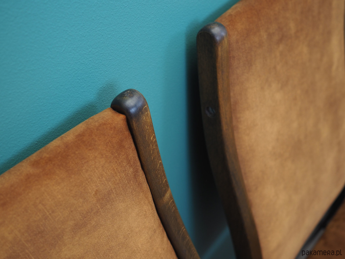Konstrukcja wykonana jest z drewna bukowego. Drewno po odświeżeniu. Krzesła posiadają nową tapicerkę. Tapicerka została wykonana w kolorze koniakowym, wykorzystana została wysokogatunkowa tkanina welurowa.
