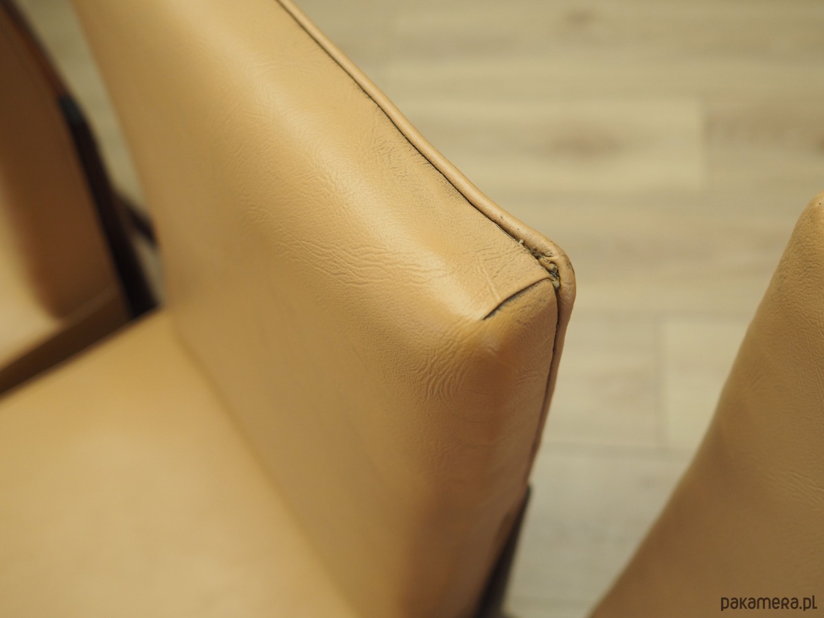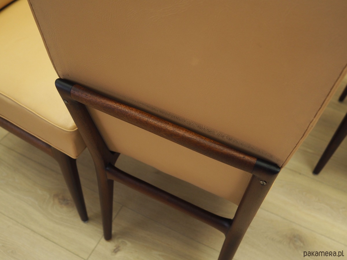 Konstrukcja wykonana jest z drewna mahoniowego. Drewno po renowacji. Krzesła posiadają oryginalną tapicerkę. Tapicerka została wykonana w kolorze beżowym, wykorzystana została wysokiej jakości ekoskóra.