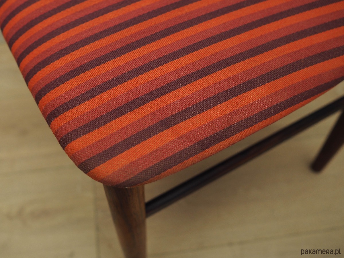 Konstrukcja wykonana jest z drewna palisandrowego. Drewno po odświeżeniu. Krzesła posiadają oryginalną tapicerkę. Tapicerka wielokolorowa, wykorzystana została wysokogatunkowa tkanina.