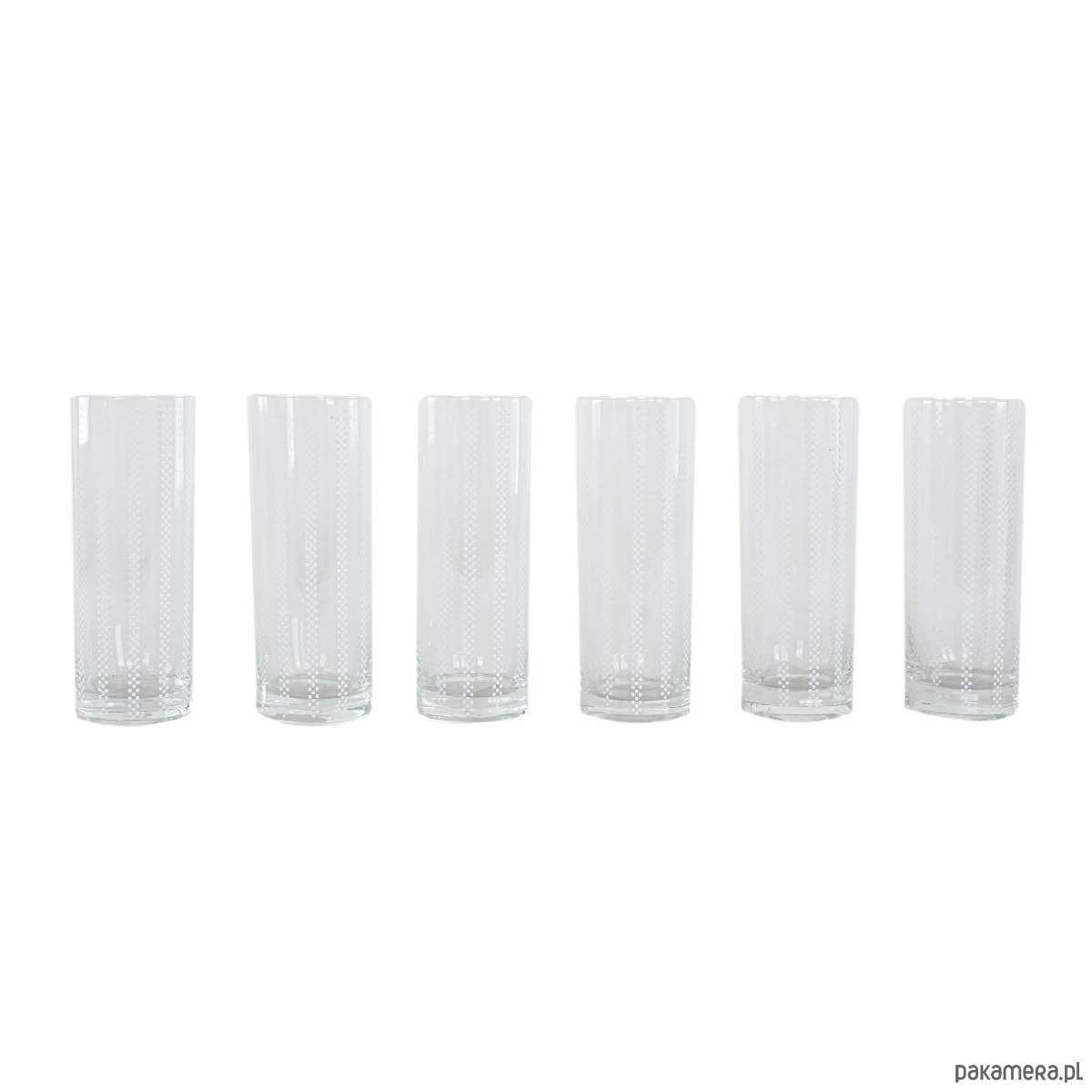 Zestaw 6 wysokich szklanek vintage z przezroczystego szkła, zdobionych białym geometrycznym nadrukiem w stylu Op Art. Design inspirowany latami 60. – lekkie, graficzne i idealne do lemoniady, drinków lub jako ozdoba barku.