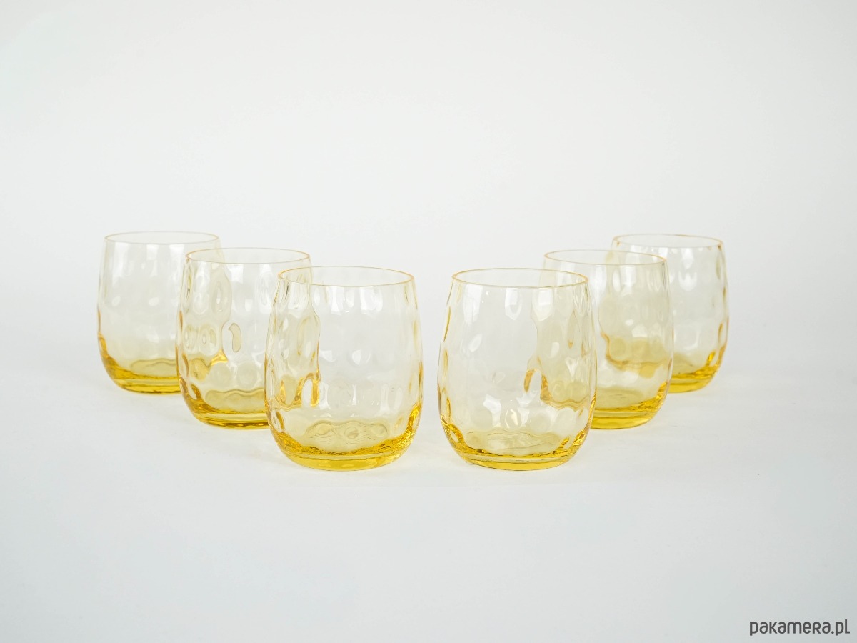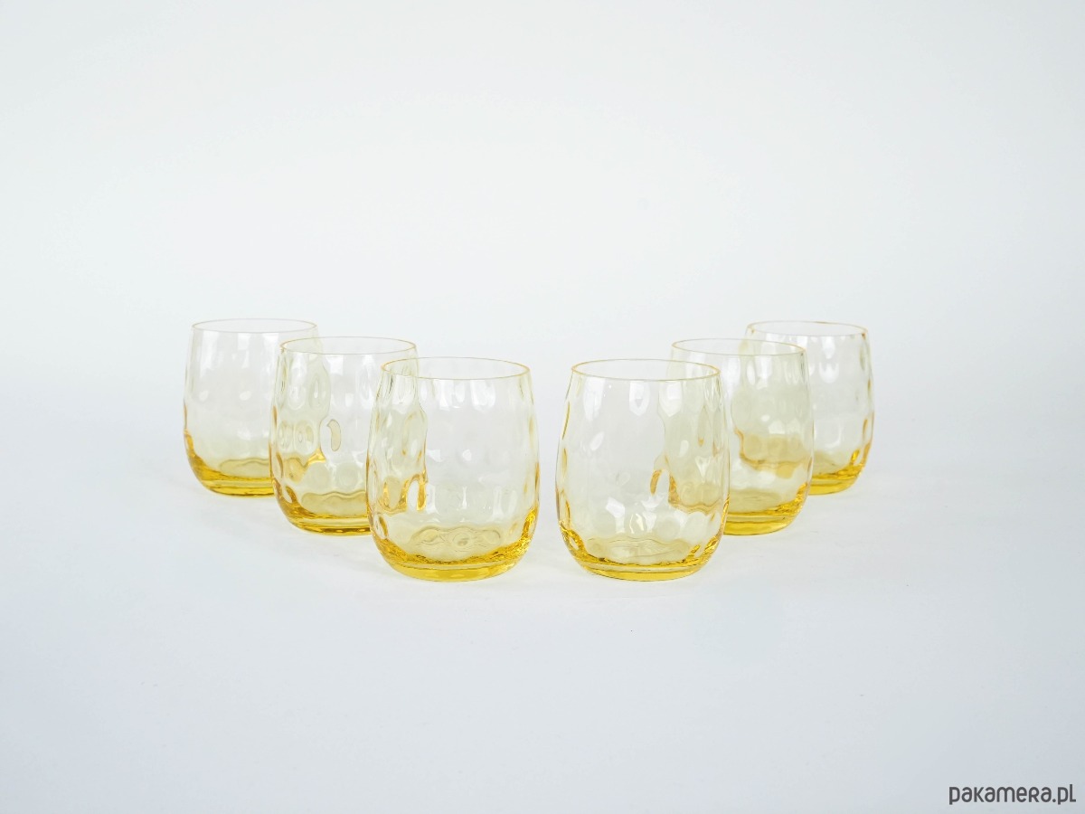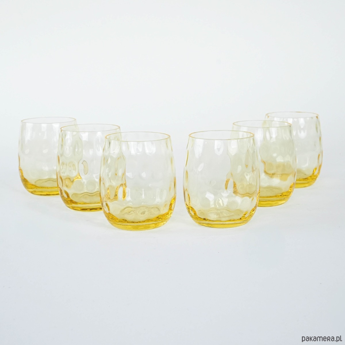 Zestaw 6 szklanek vintage z lat 60.–70., wykonanych ze szkła barwionego w kolorze miodowo-żółtym z dekoracyjnym tłoczeniem typu „optic bubbles”. Oryginalny komplet, w doskonałym stanie kolekcjonerskim.