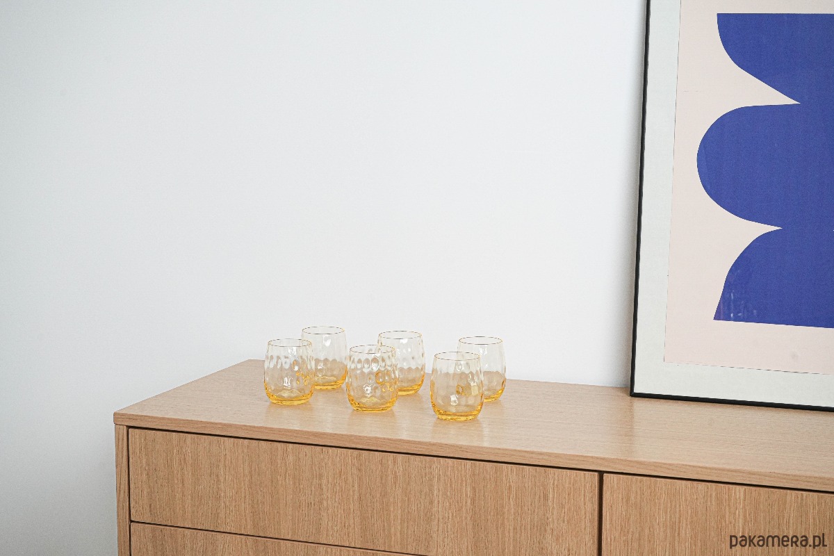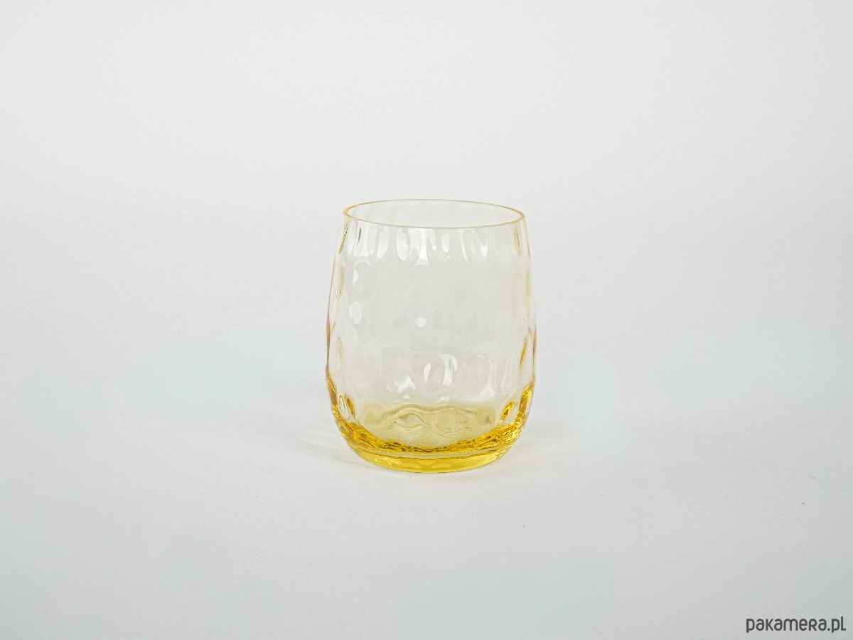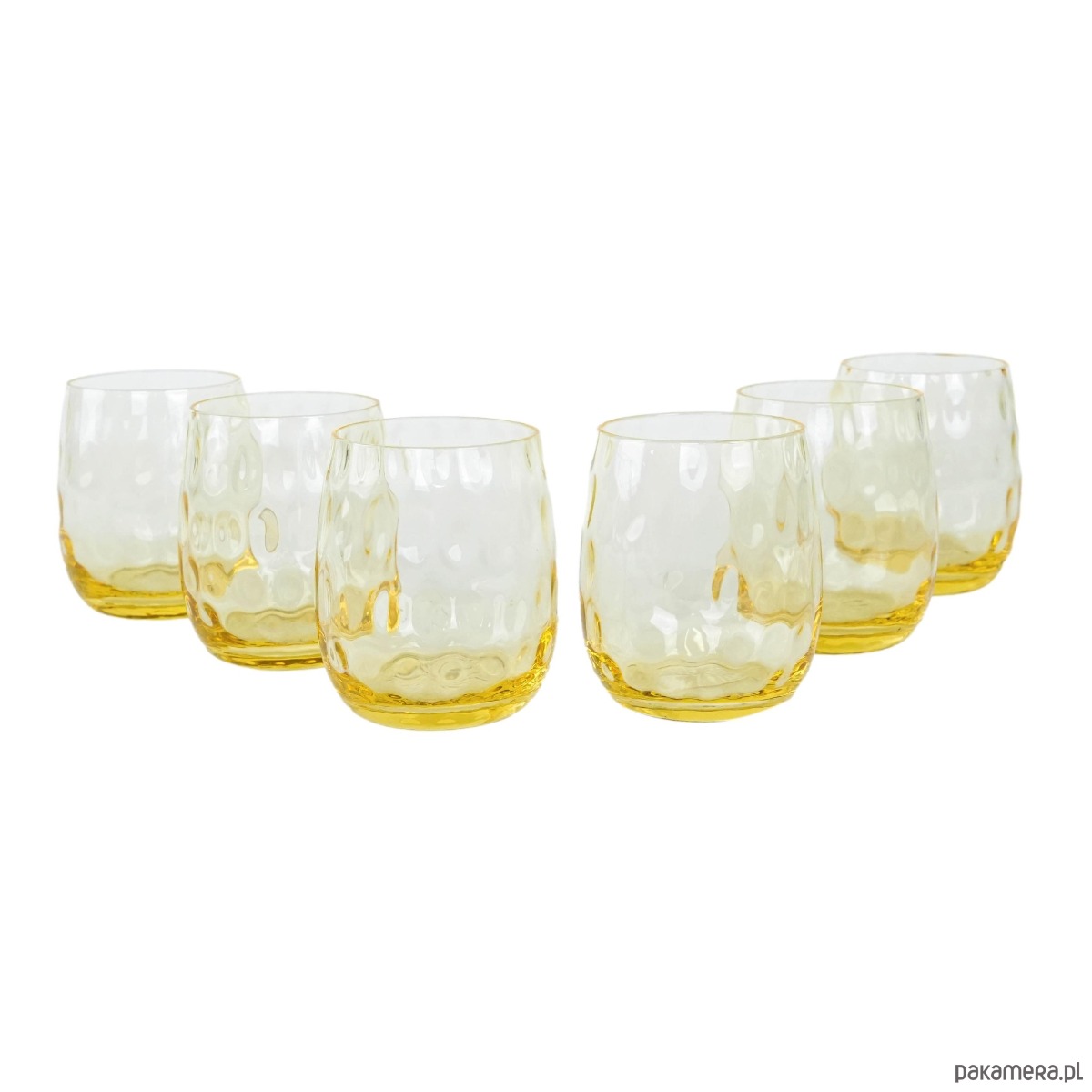 Zestaw 6 szklanek vintage z lat 60.–70., wykonanych ze szkła barwionego w kolorze miodowo-żółtym z dekoracyjnym tłoczeniem typu „optic bubbles”. Oryginalny komplet, w doskonałym stanie kolekcjonerskim.