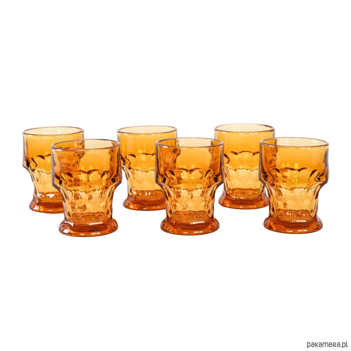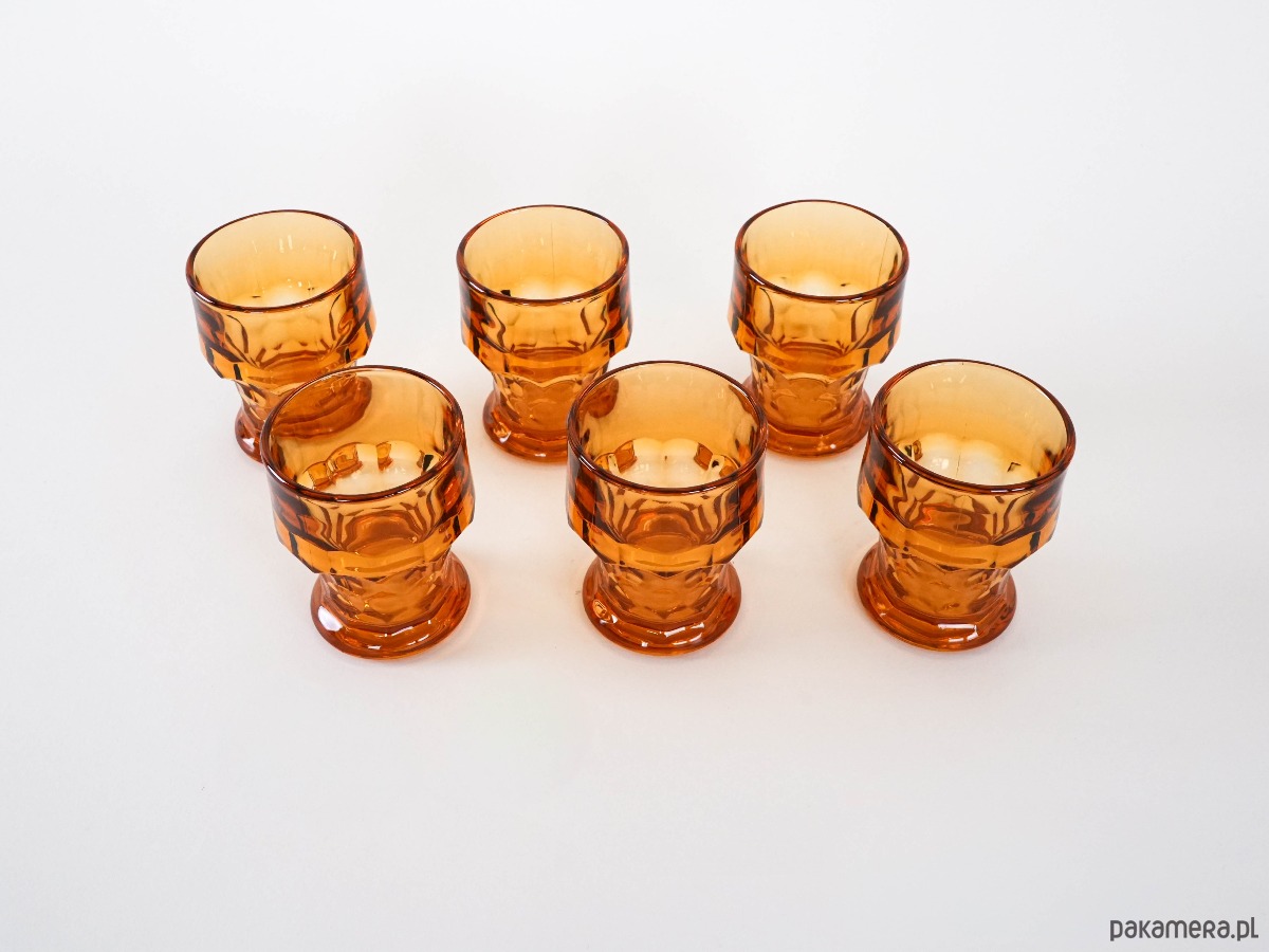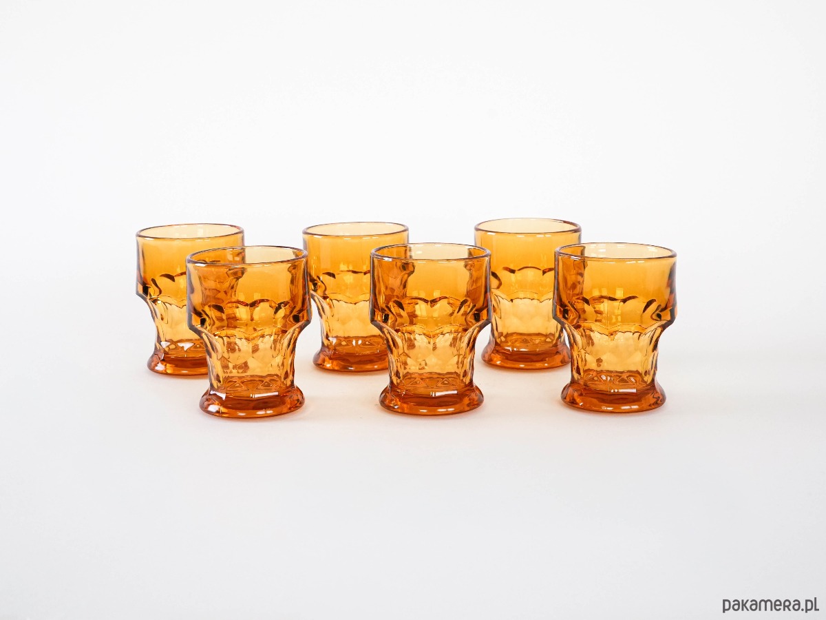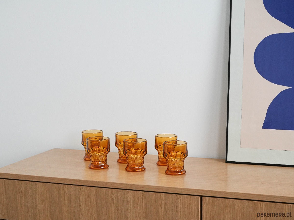 Szklanki wykonane ze szkła o ciepłym, nasyconym pomarańczowym odcieniu charakterystycznym dla wzornictwa tej dekady. Szklanki doskonale wpisują się w estetykę retro oraz mid-century, stanowiąc zarówno praktyczny element zastawy stołowej, jak i dekoracyjny akcent na stole lub w witrynie. Idealne do serwowania wody, soków, drinków czy koktajli. Zestaw będzie świetnym wyborem dla miłośników szkła vintage oraz kolekcjonerów designu z lat 70.