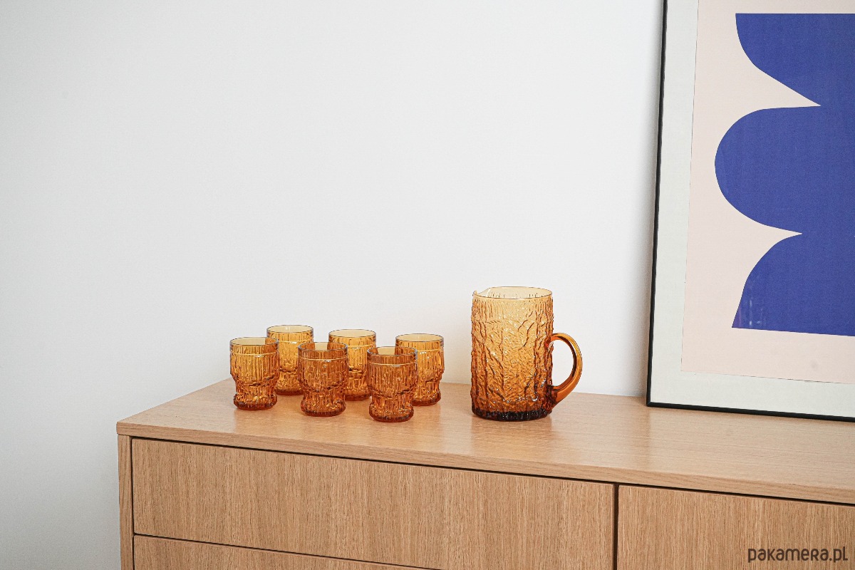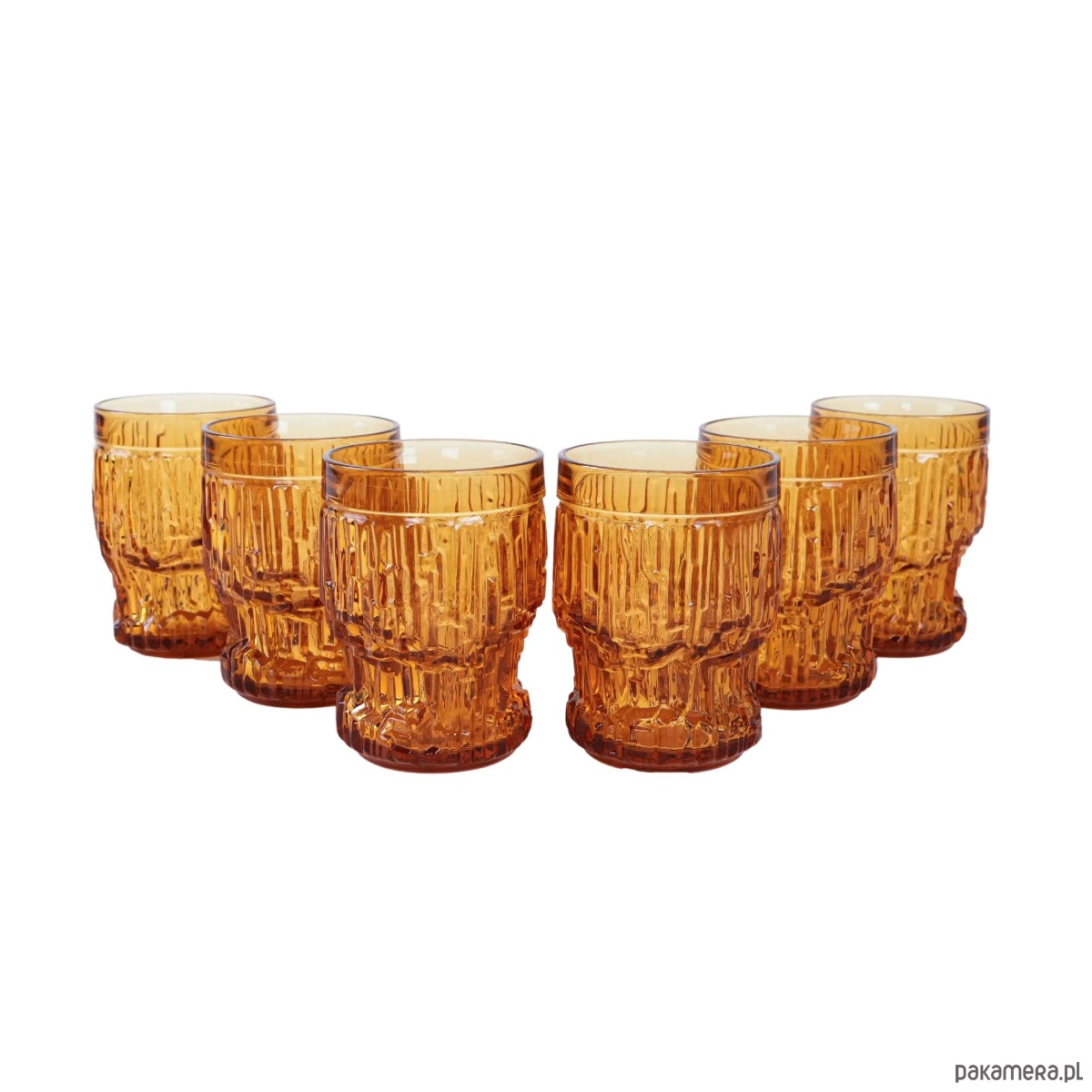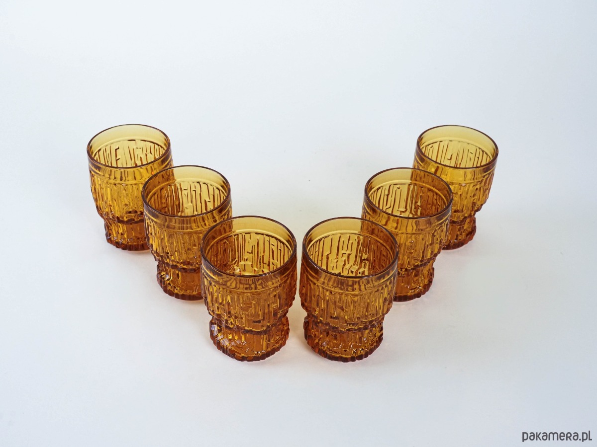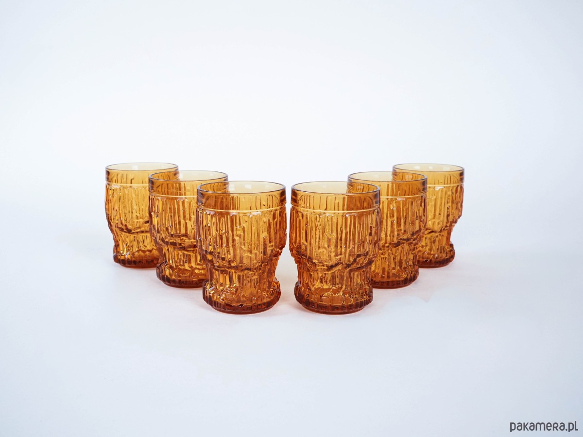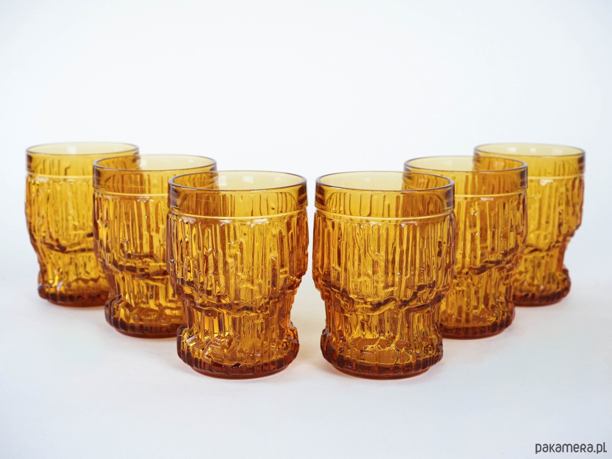 Komplet 6 szklanek z lat 60./70., wykonanych z tłoczonego szkła w kolorze bursztynowym. Charakterystyczna faktura przypominająca strukturę kory tworzy ciekawy efekt optyczny i nadaje naczyniom unikalny, dekoracyjny charakter. Oryginalne egzemplarze vintage – cenione zarówno użytkowo, jak i kolekcjonersko.
