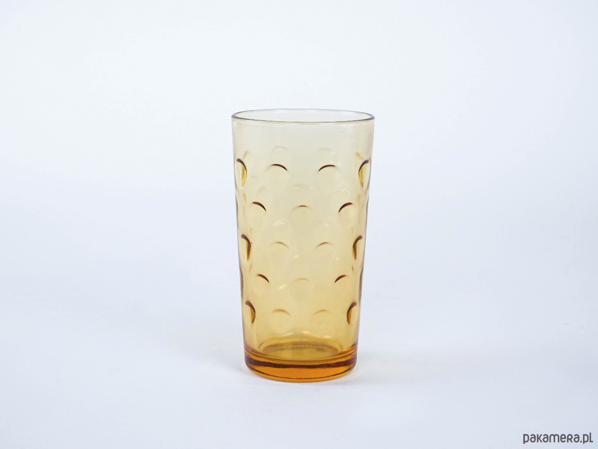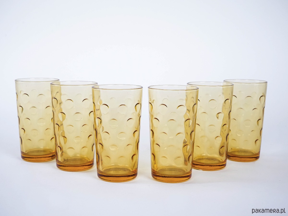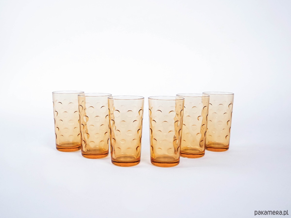 Komplet 6 szklanek z barwionego szkła, dekorowanych tłoczeniem w formie regularnych wgłębień typu „coin dot”. Geometryczny relief nadaje im nowoczesny charakter, typowy dla wzornictwa użytkowego lat 70. Oryginalne egzemplarze vintage, łączące funkcjonalność z kolekcjonerską wartością.