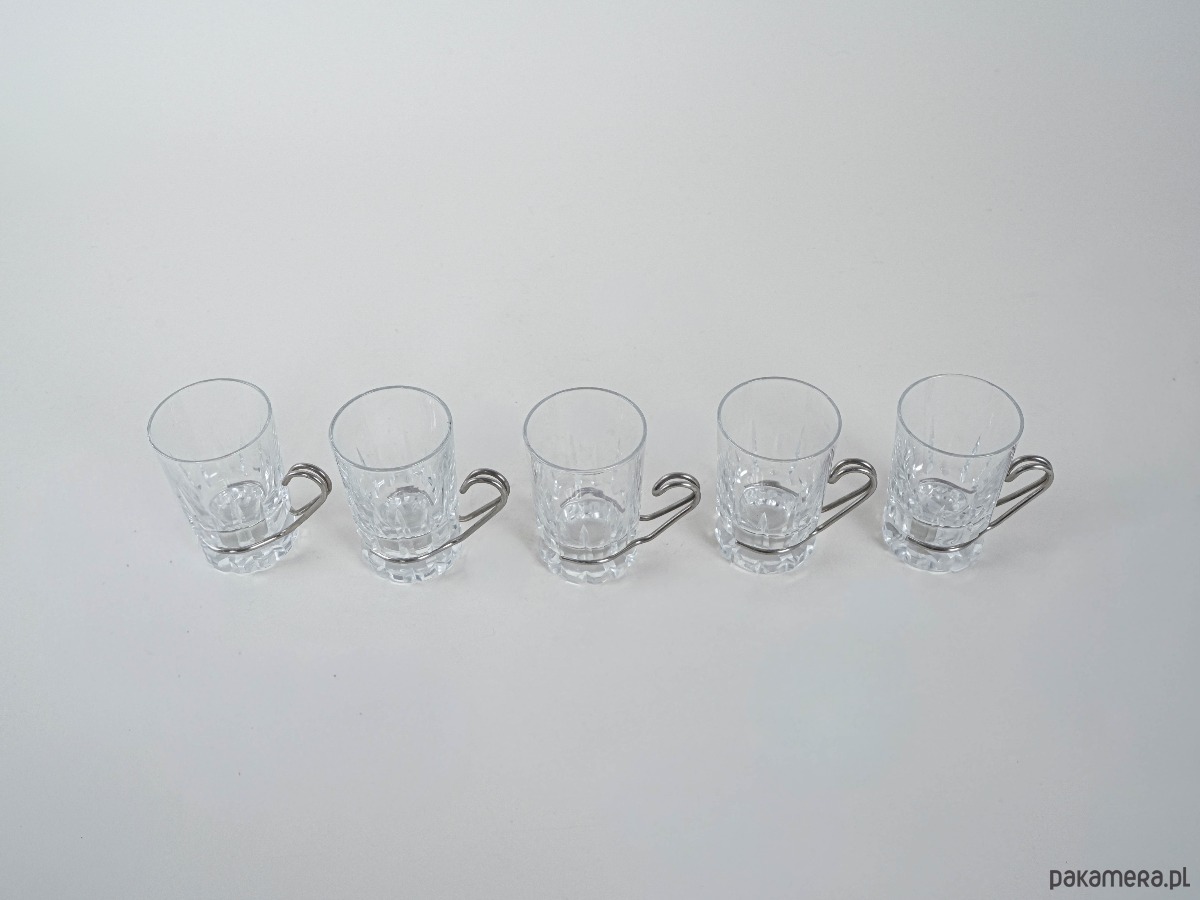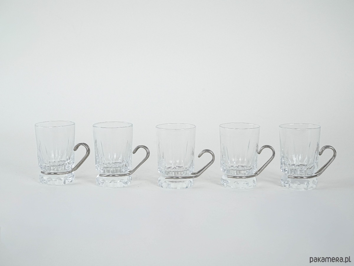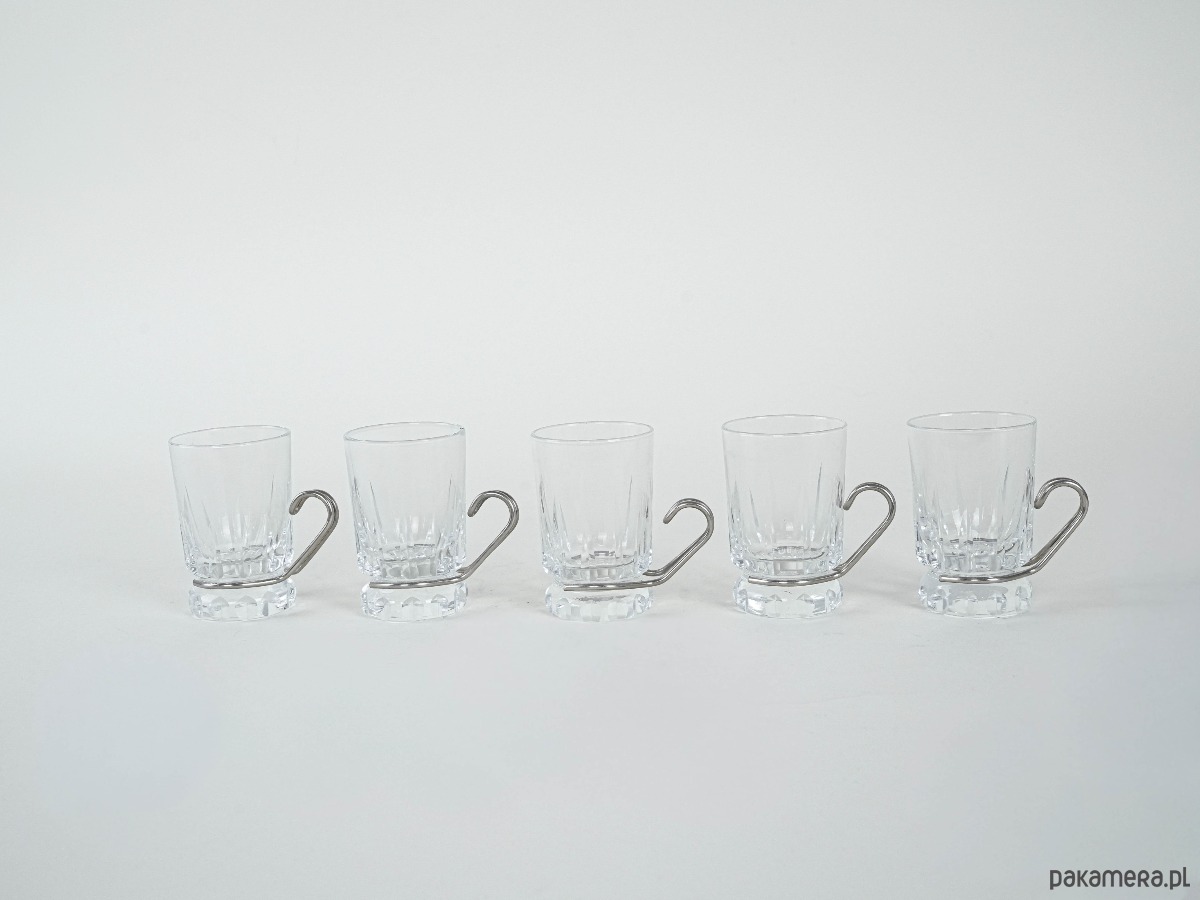 Szklanki do espresso lub herbaty w stylu modernistycznym, lata 70. XX wieku. Kryształowe szkło o grubym, szlifowanym dnie osadzone w stalowym uchwycie o minimalistycznej, geometrycznej linii. Połączenie transparentnego szkła z metalem jest charakterystyczne dla wzornictwa modern i Bauhaus revival, gdzie prostota formy spotyka się z funkcjonalnością.
