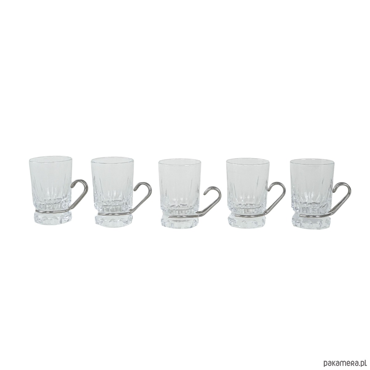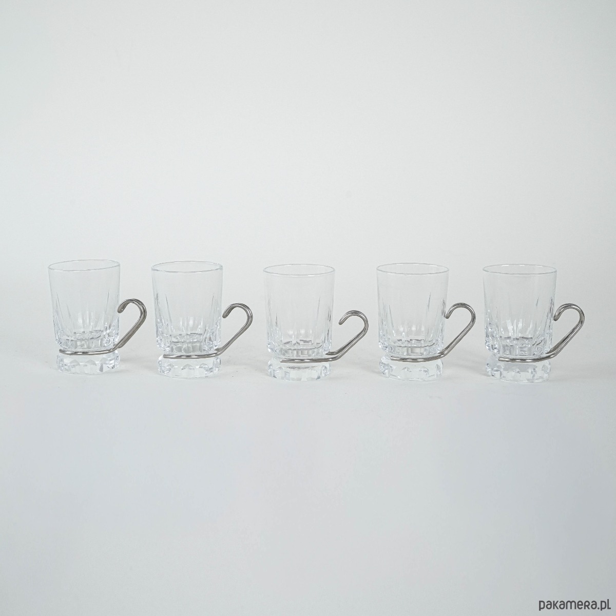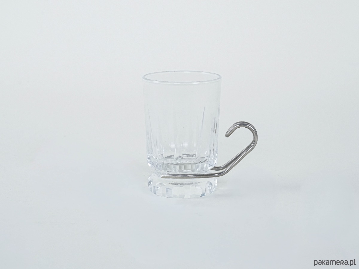 Szklanki do espresso lub herbaty w stylu modernistycznym, lata 70. XX wieku. Kryształowe szkło o grubym, szlifowanym dnie osadzone w stalowym uchwycie o minimalistycznej, geometrycznej linii. Połączenie transparentnego szkła z metalem jest charakterystyczne dla wzornictwa modern i Bauhaus revival, gdzie prostota formy spotyka się z funkcjonalnością.