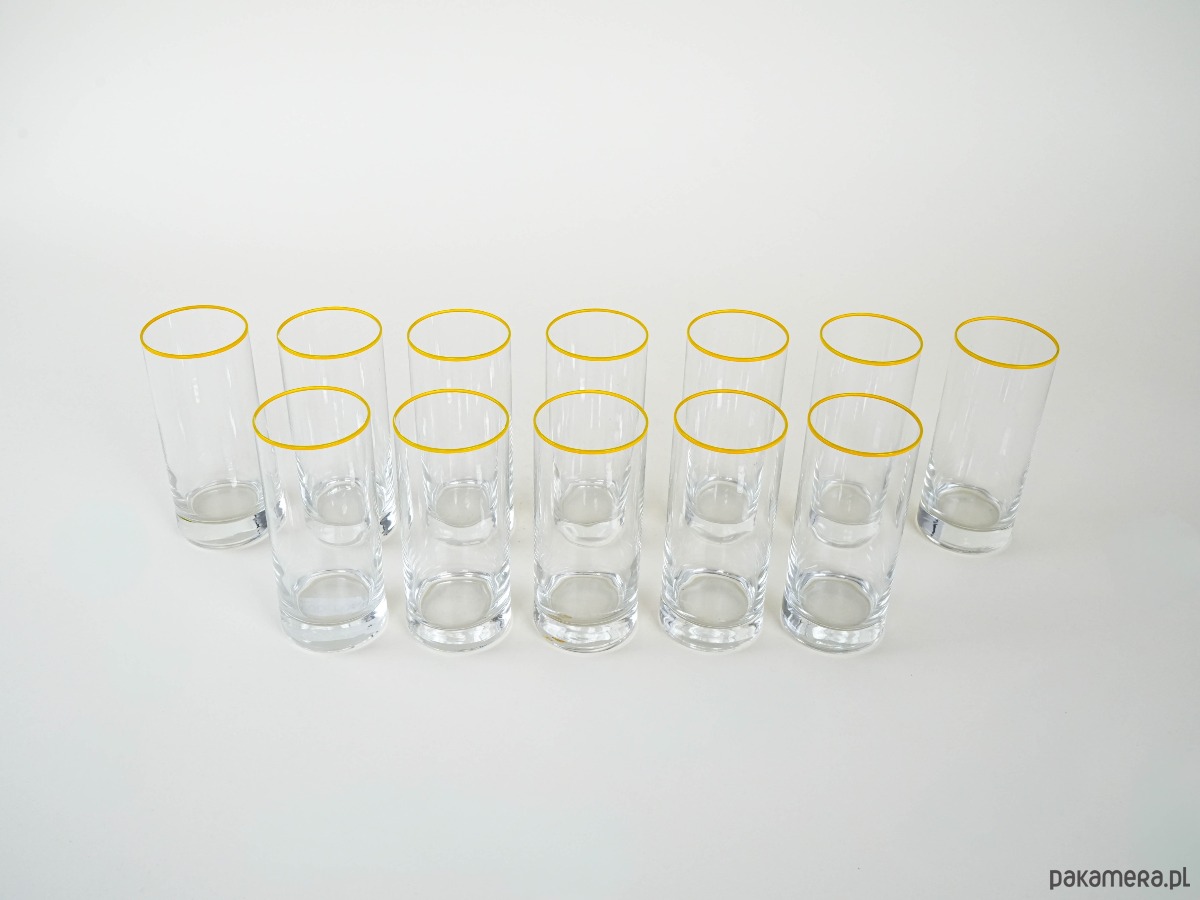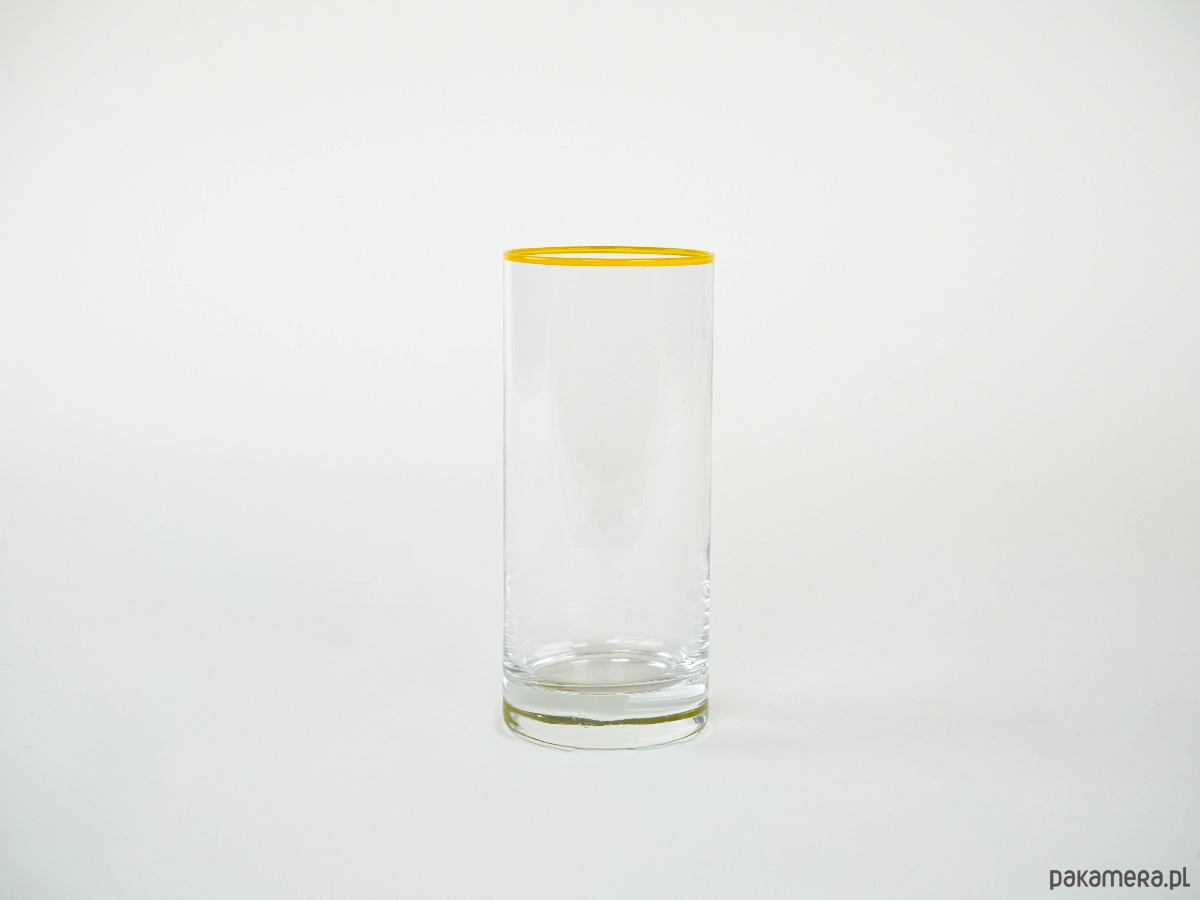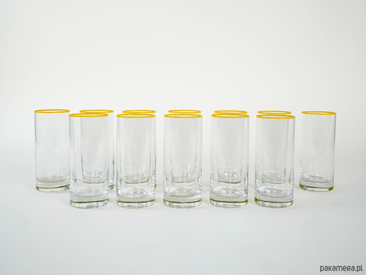 Komplet 12 wysokich szklanek typu highball z przejrzystego szkła, dekorowanych subtelną żółtą linią przy krawędzi. Minimalistyczny, elegancki design przywodzi na myśl wzornictwo modernistyczne lat 60.–70. XX wieku, popularne w Europie Środkowej.