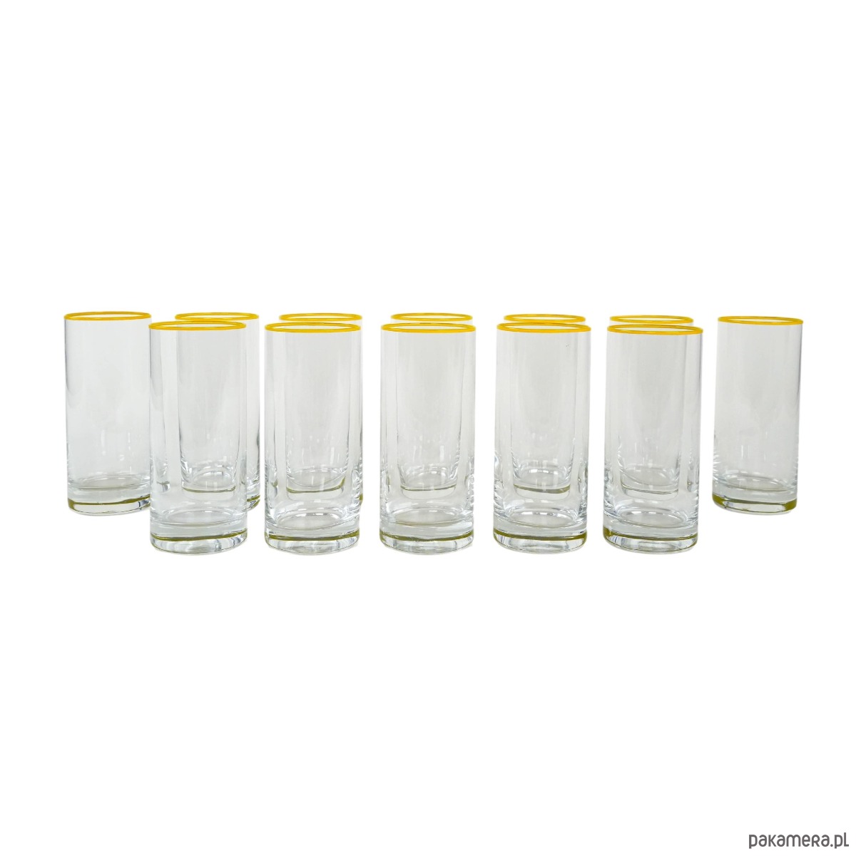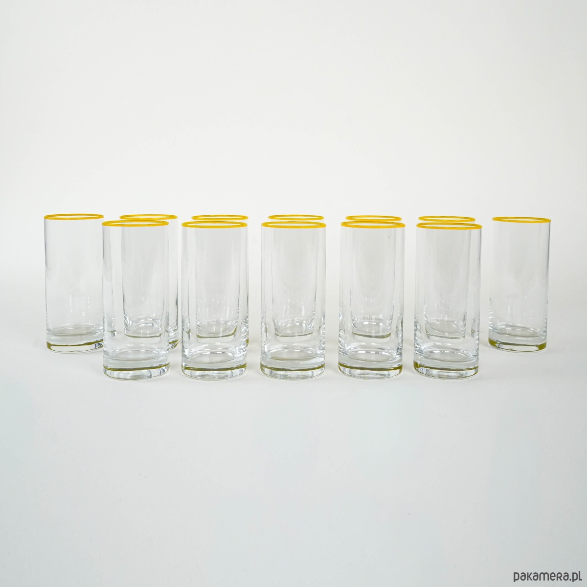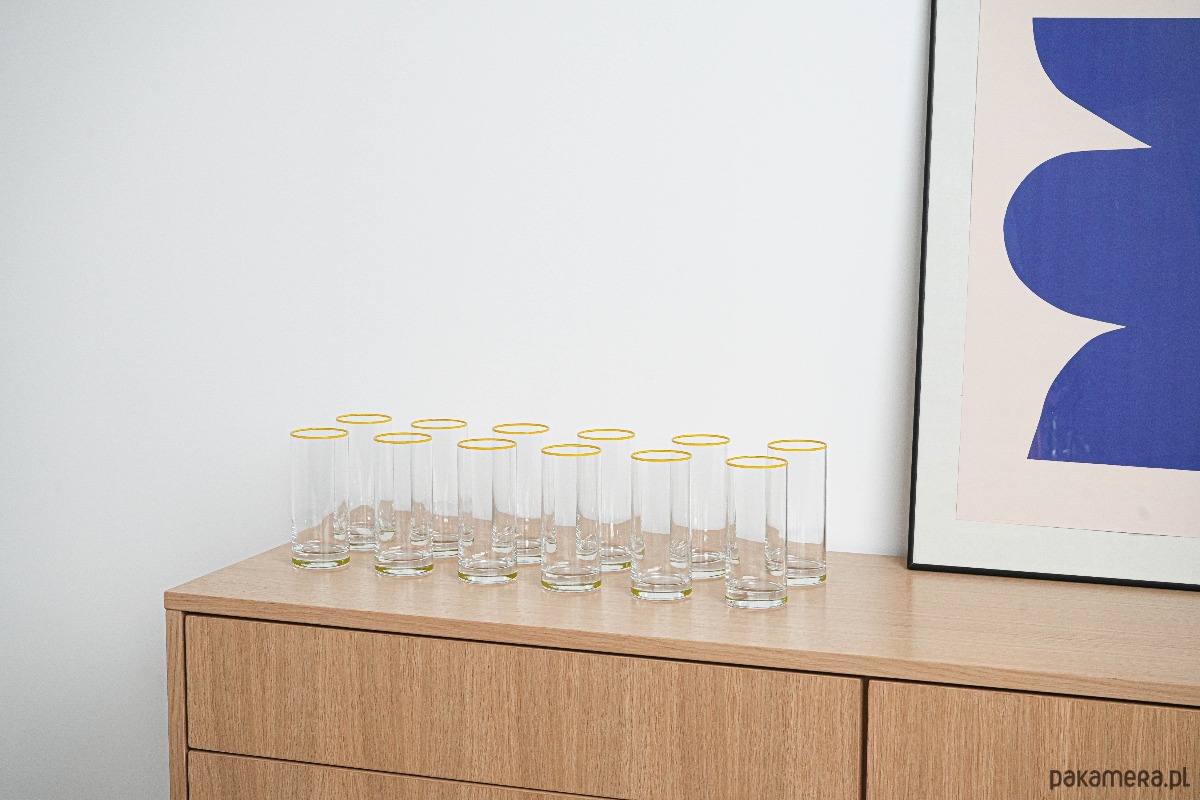 Komplet 12 wysokich szklanek typu highball z przejrzystego szkła, dekorowanych subtelną żółtą linią przy krawędzi. Minimalistyczny, elegancki design przywodzi na myśl wzornictwo modernistyczne lat 60.–70. XX wieku, popularne w Europie Środkowej.