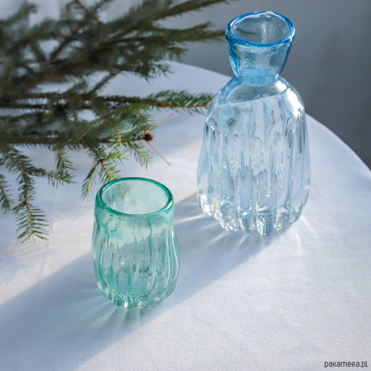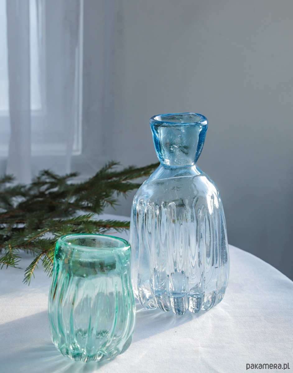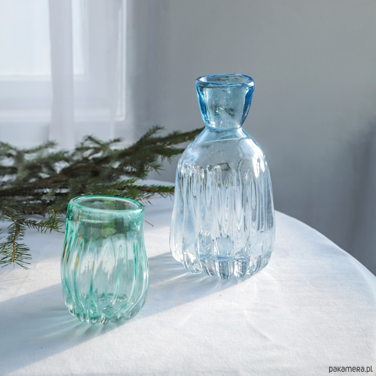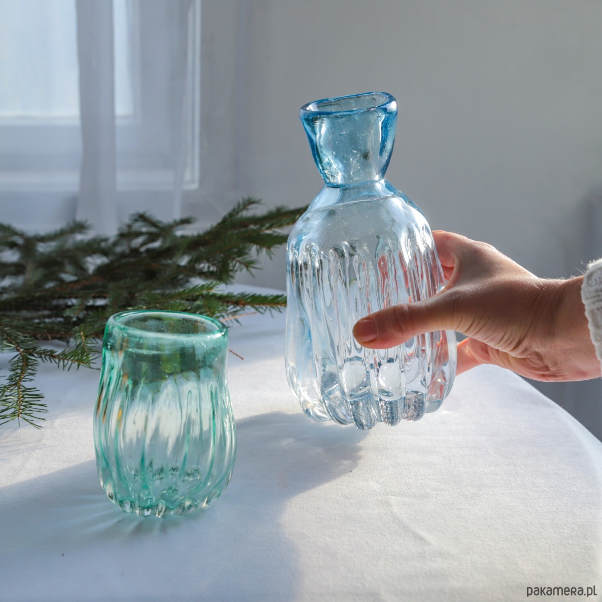 Nieregularna, poręczna szklanka i karafka idealne leży w dłoni.