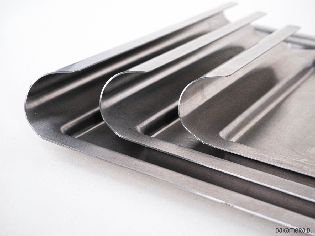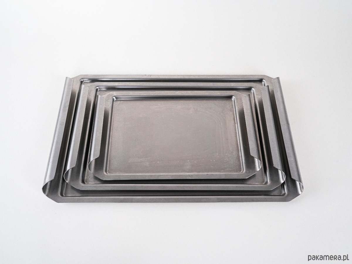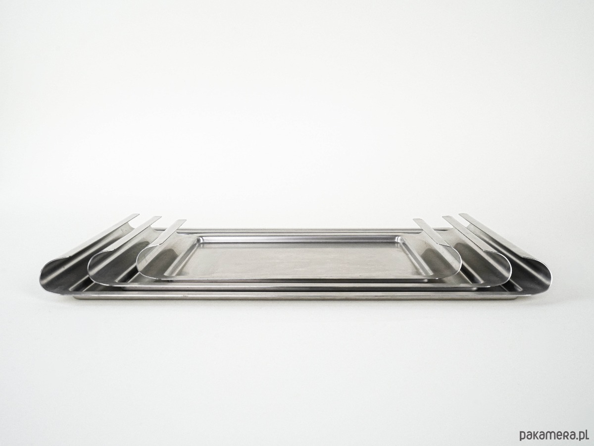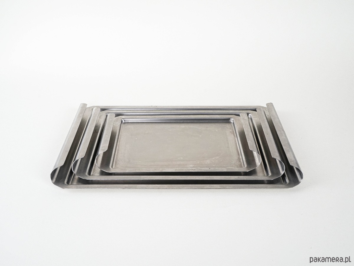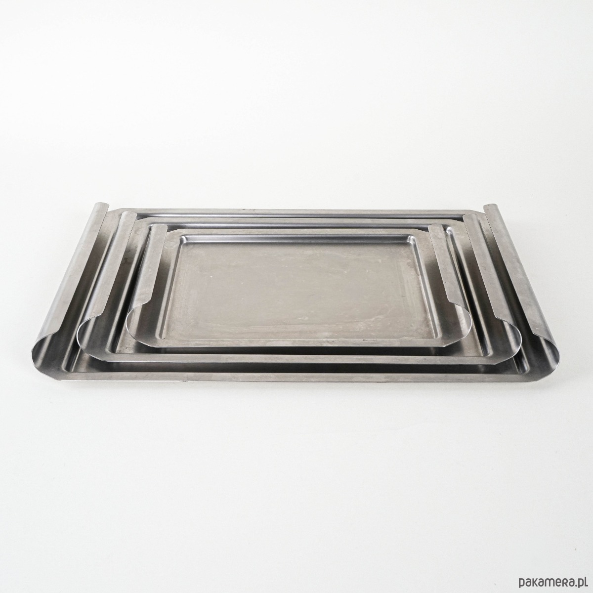 Komplet tac ze stali nierdzewnej wykonany w latach 70-tych, produkcja włoska.